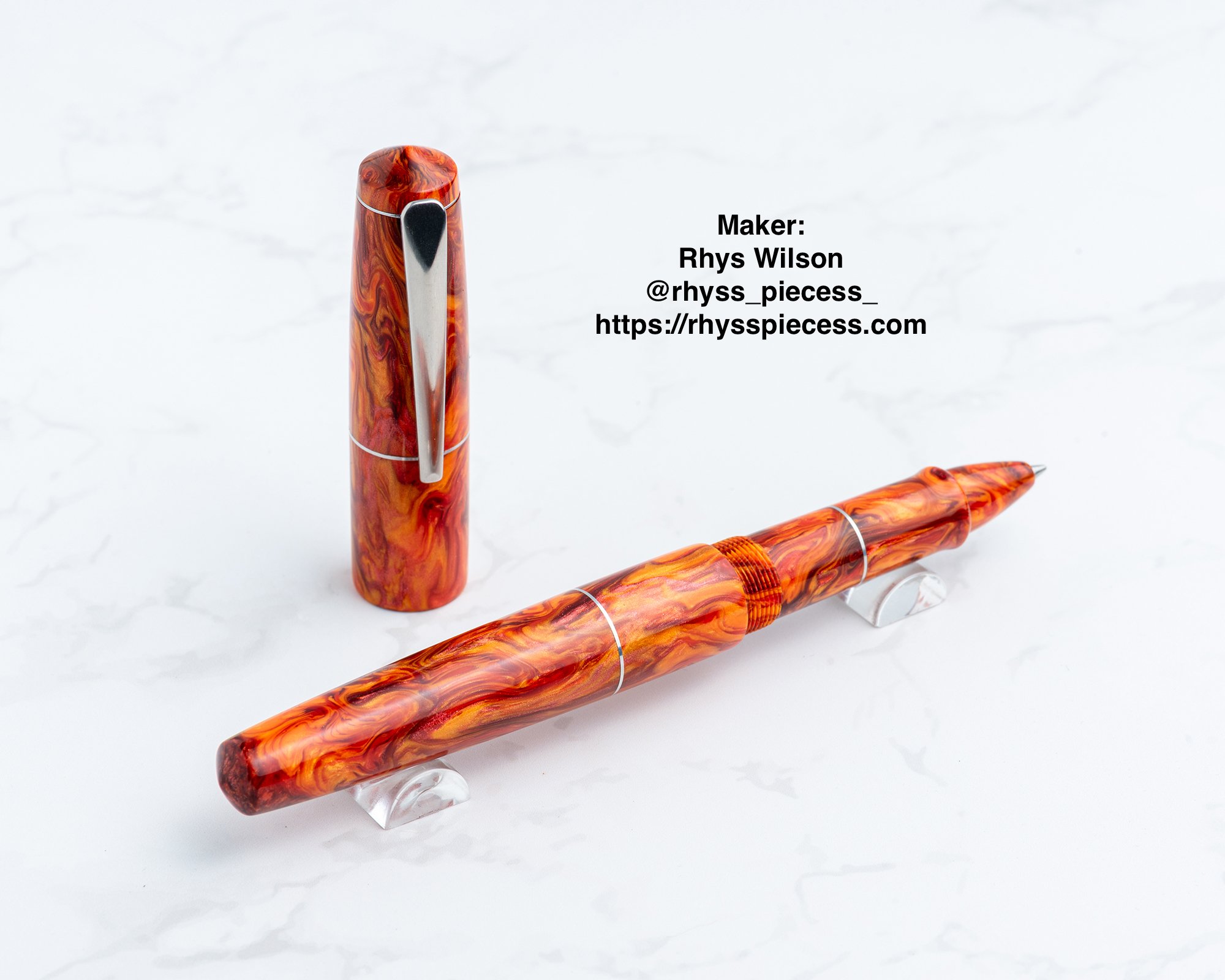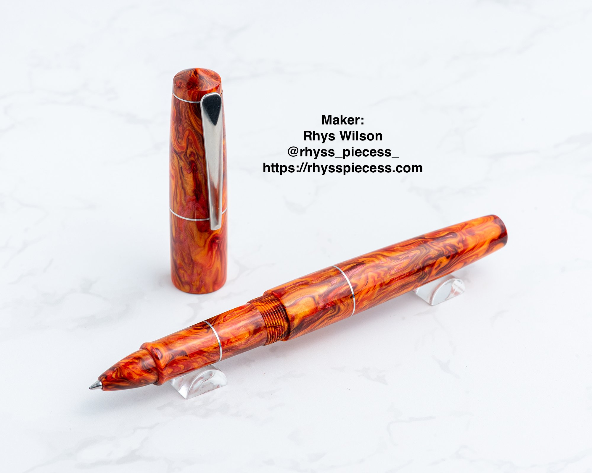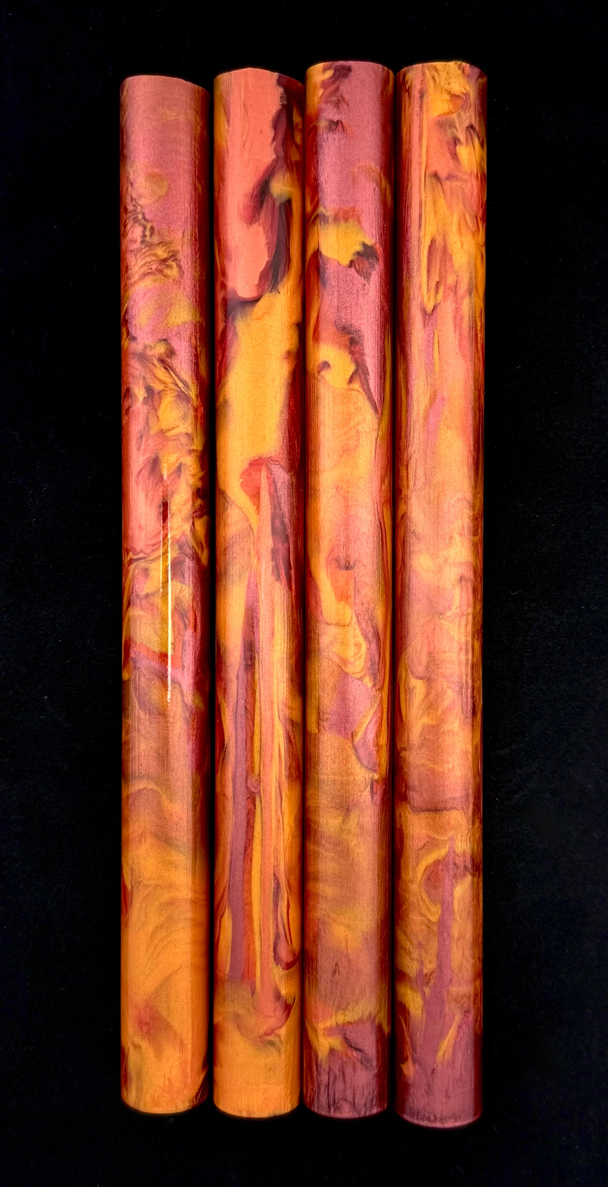 Premium, one of a kind custom bespoke pen blanks. High pressure cast and cured with Alumilite Resin® and unique blends of high quality pigments. 'Mordor's Watchman' is beautiful blank with several shades of orange, red and burgundy. Made in small batches, these high-quality blanks are perfect for custom pen makers and anyone who wants unique materials for their creations.