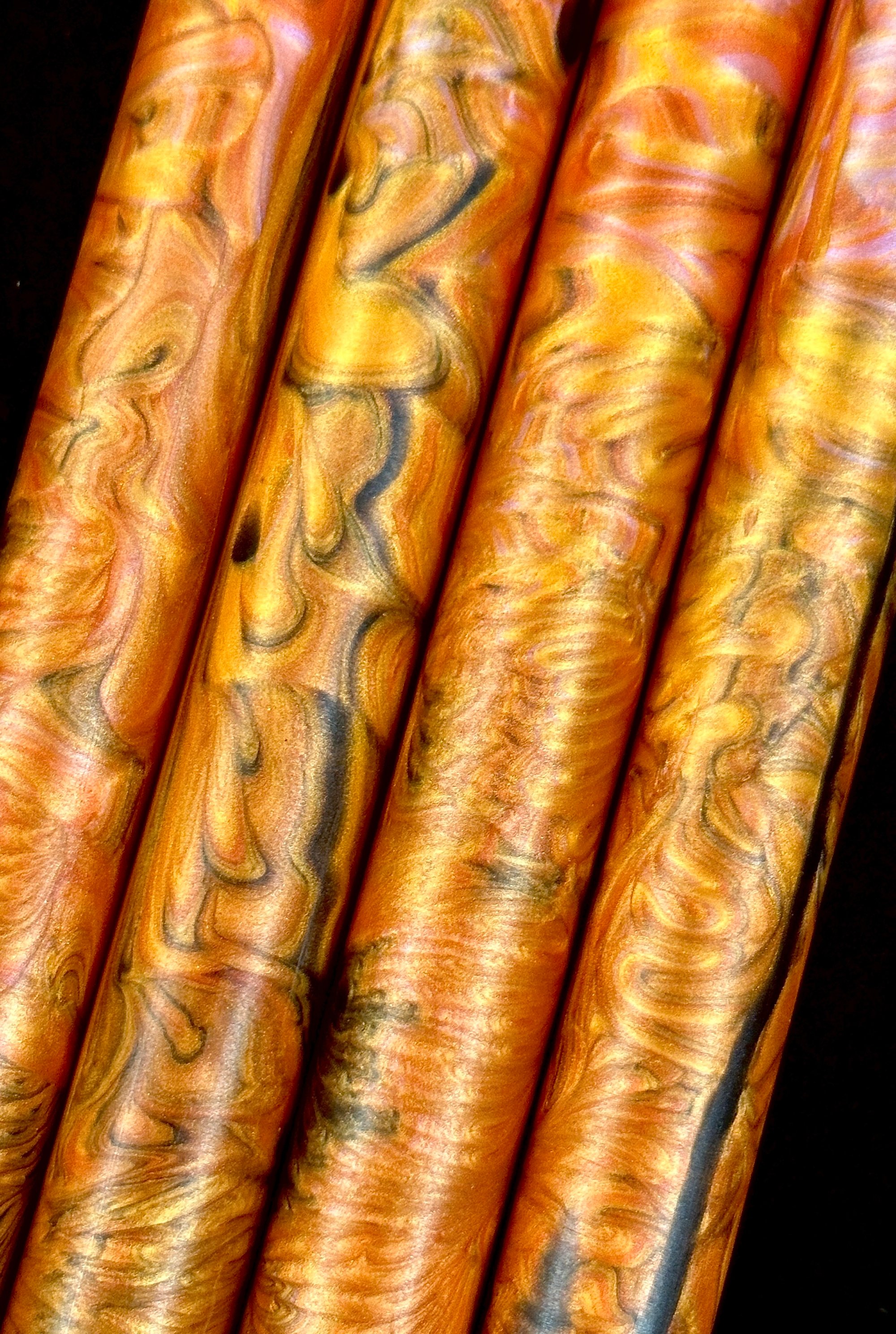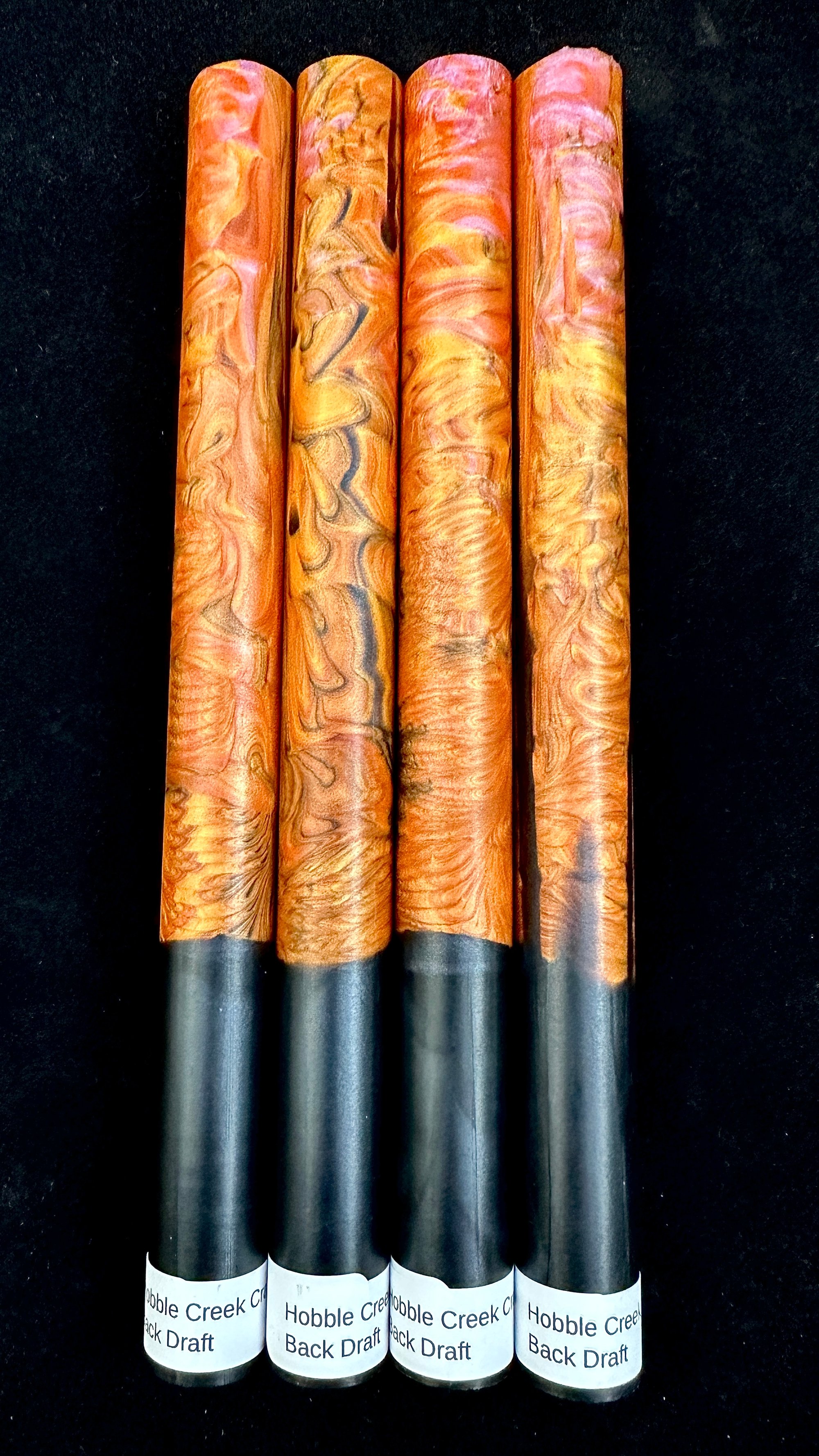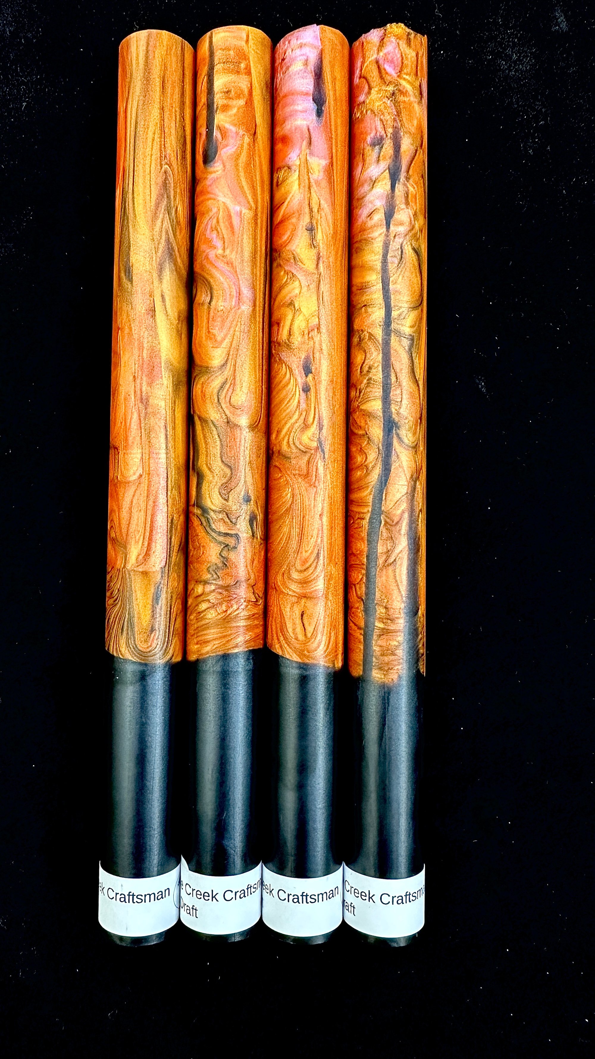 Premium, one of a kind custom bespoke pen blanks. High pressure cast and cured with Alumilite Resin® and unique blends of Eye Candy® mica pigments. 'Back Draft' includes several shades of red, pink, orange and opaque black. Made in small batches. These are exclusive, top of the line blanks we offer to custom pen makers. Perfect for the high end fountain pen maker, but would also look fantastic on a kit pen.