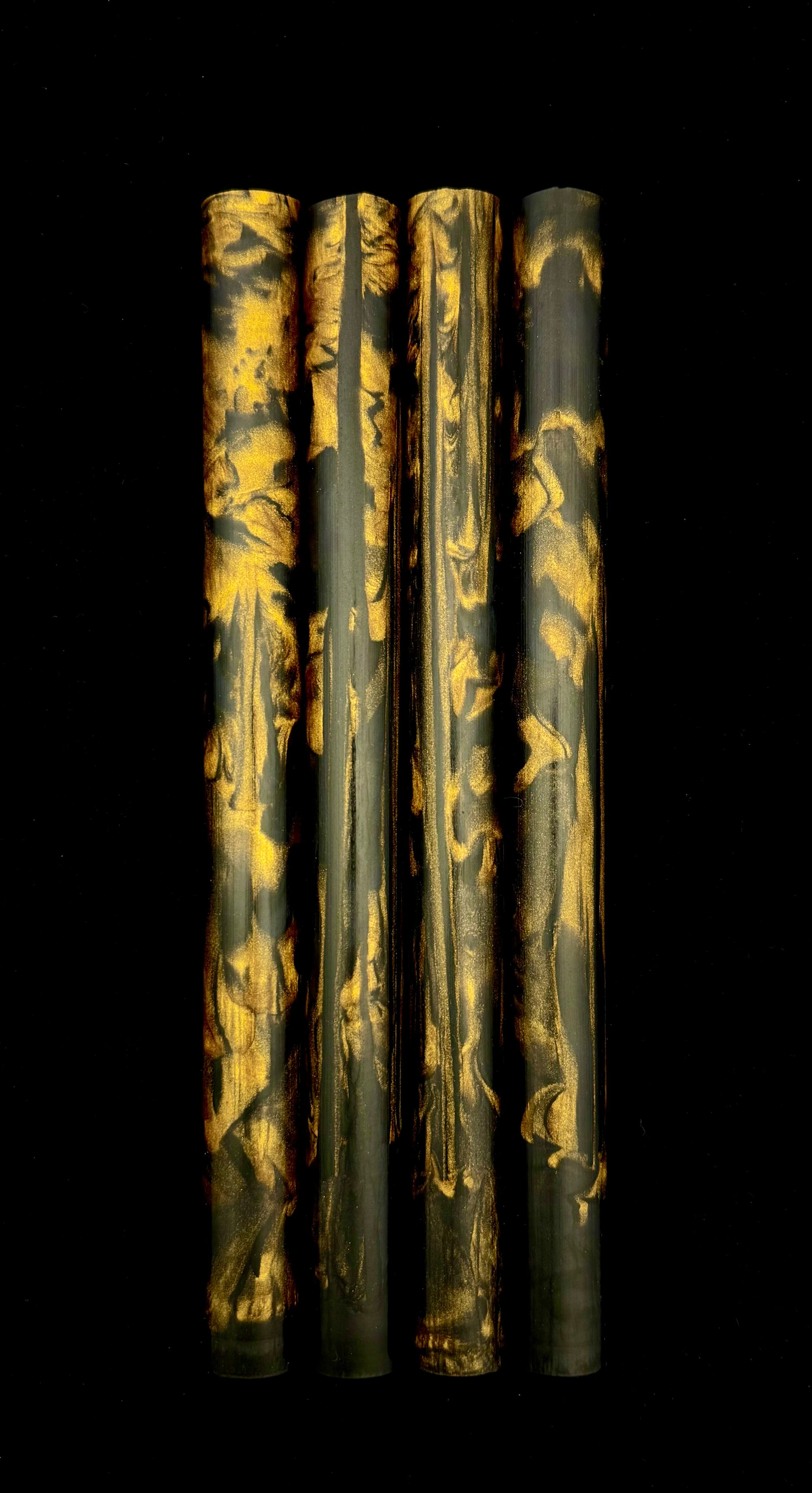 Premium, one of a kind custom bespoke pen blanks. High pressure cast and cured with Alumilite Resin® and unique blends of high quality mica pigments. 'Black Briar' is a great combination of mottled black and shimmery mirror gold. Made in small batches, these high-quality blanks are perfect for custom pen makers and anyone who wants unique materials for their creations.