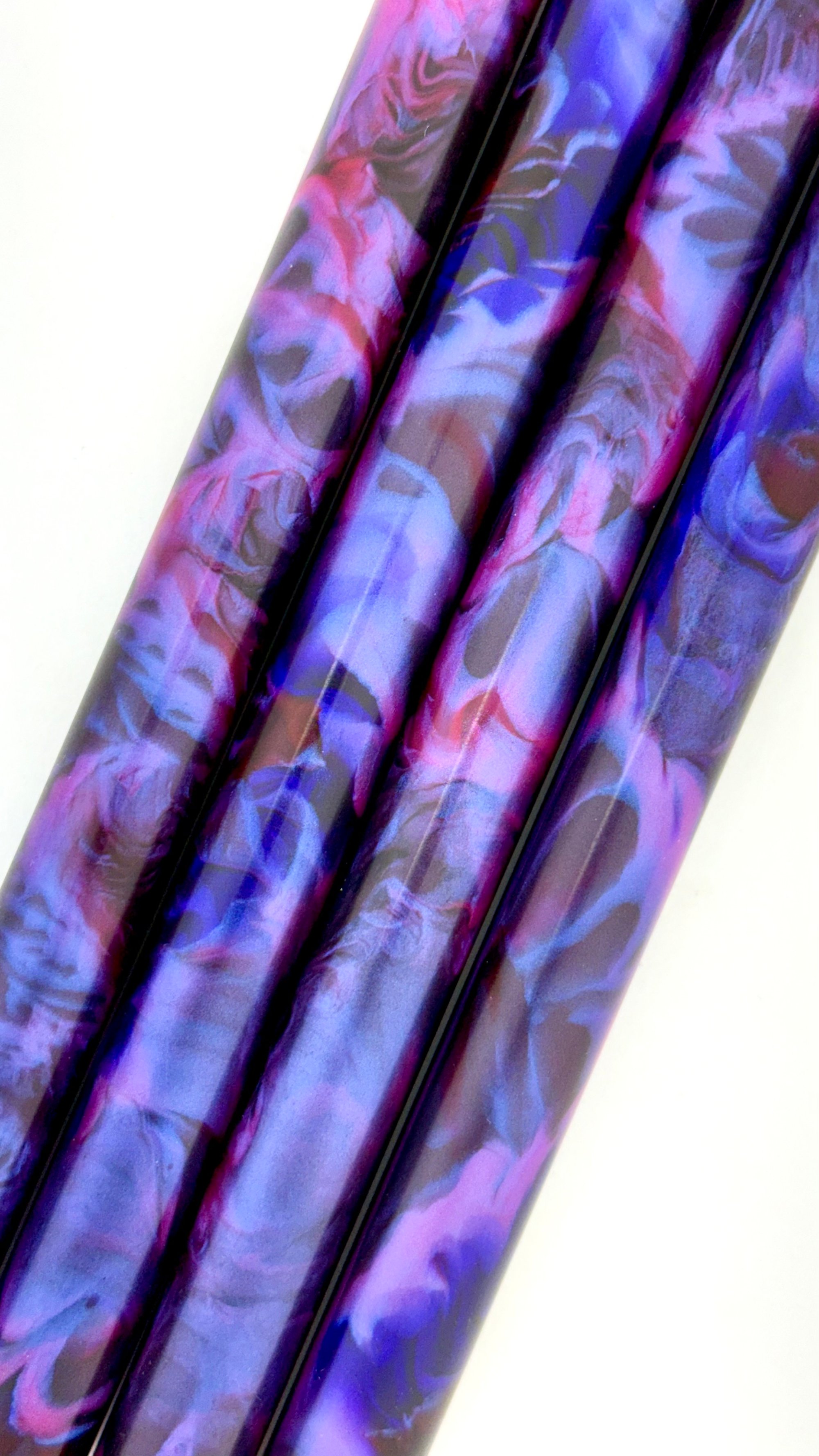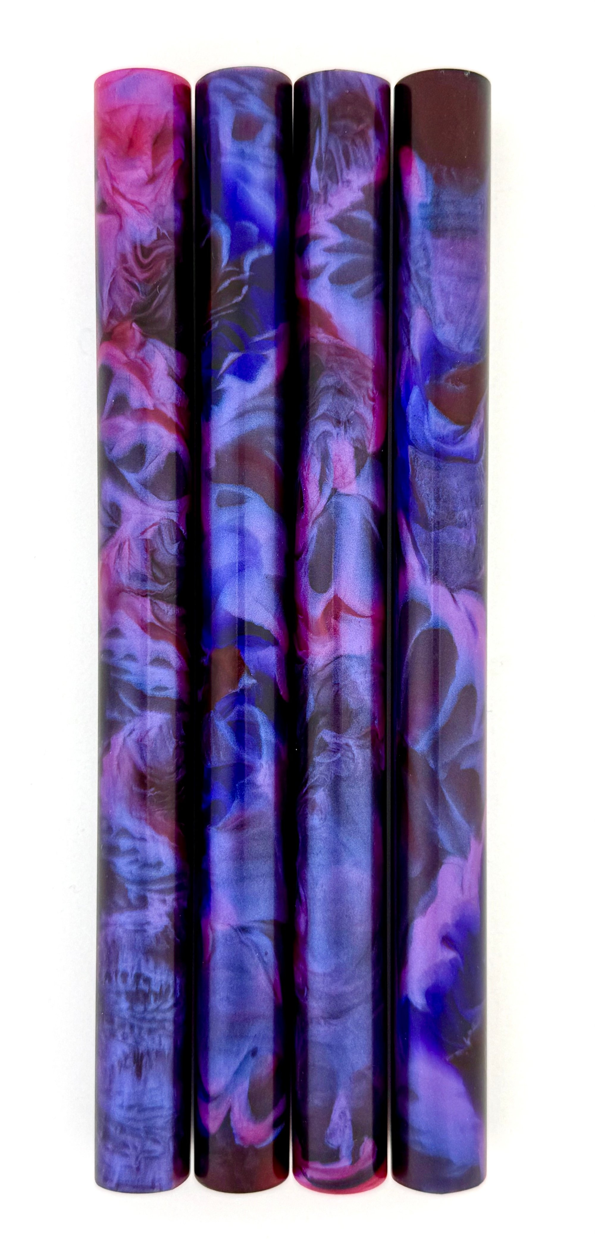 Premium, one of a kind custom bespoke pen blanks. High pressure cast and cured with Alumilite Resin®. 'Black Rose' is a great mix of high grade pigments and dyes, including several shades of purple, red and pink, along with complimentary translucent colors. Made in small batches, these are exclusive, top of the line blanks we offer with high end fountain pen makers in mind, but they're also great for any maker looking for unique material.