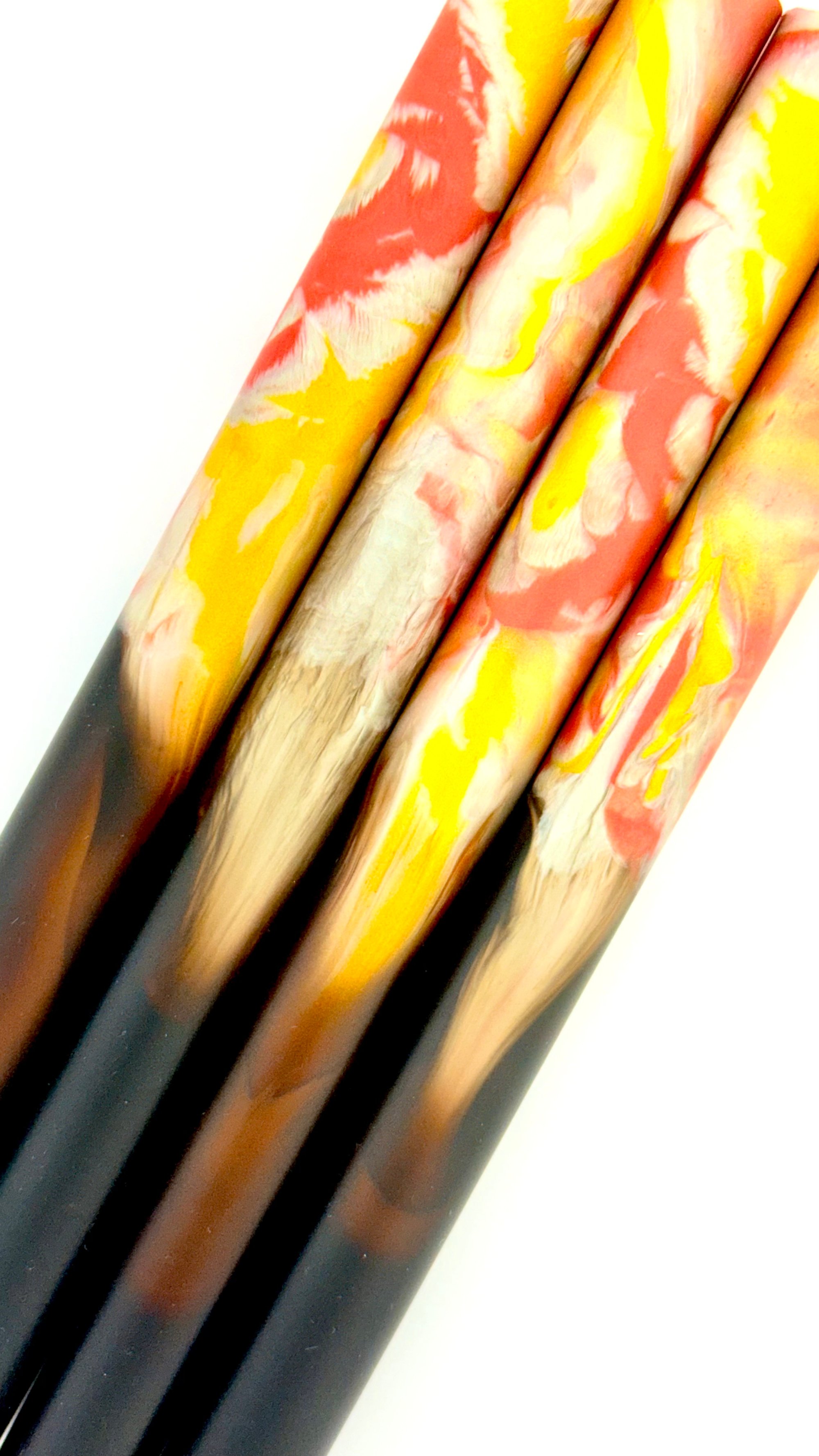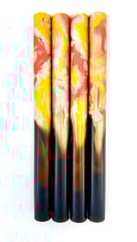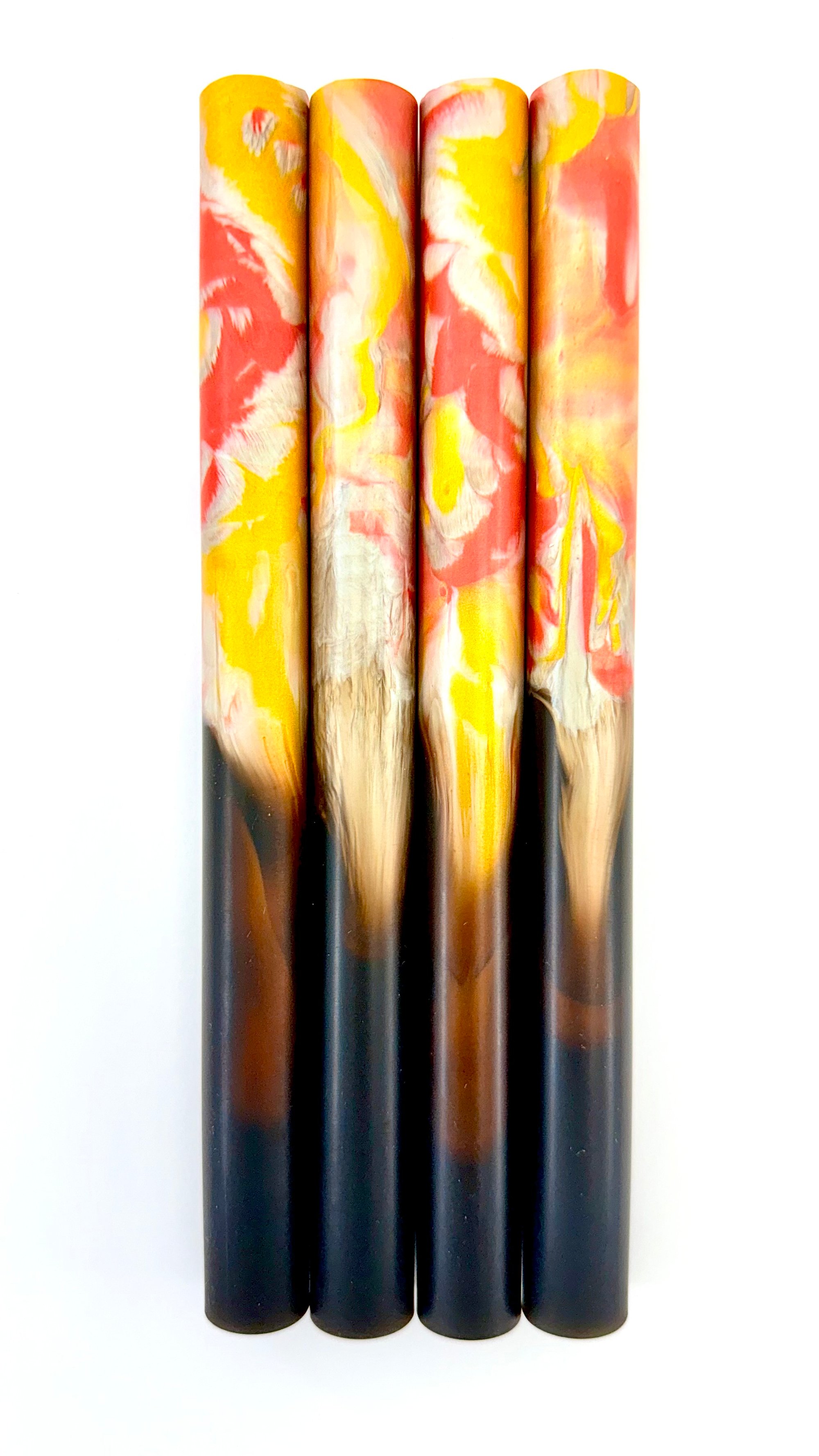 Premium, one of a kind custom bespoke pen blanks. High pressure cast and cured with Alumilite Resin®. 'Butter On My Biscuits' is a great mix of high grade pigments and dyes, including a translucent brown bottom that's topped off with buttery yellow, marmalade orange and creamer white, with complimentary translucent colors. Made in small batches, these are exclusive, top of the line blanks we offer with high end fountain pen makers in mind, but they're also great for any maker looking for unique material.
