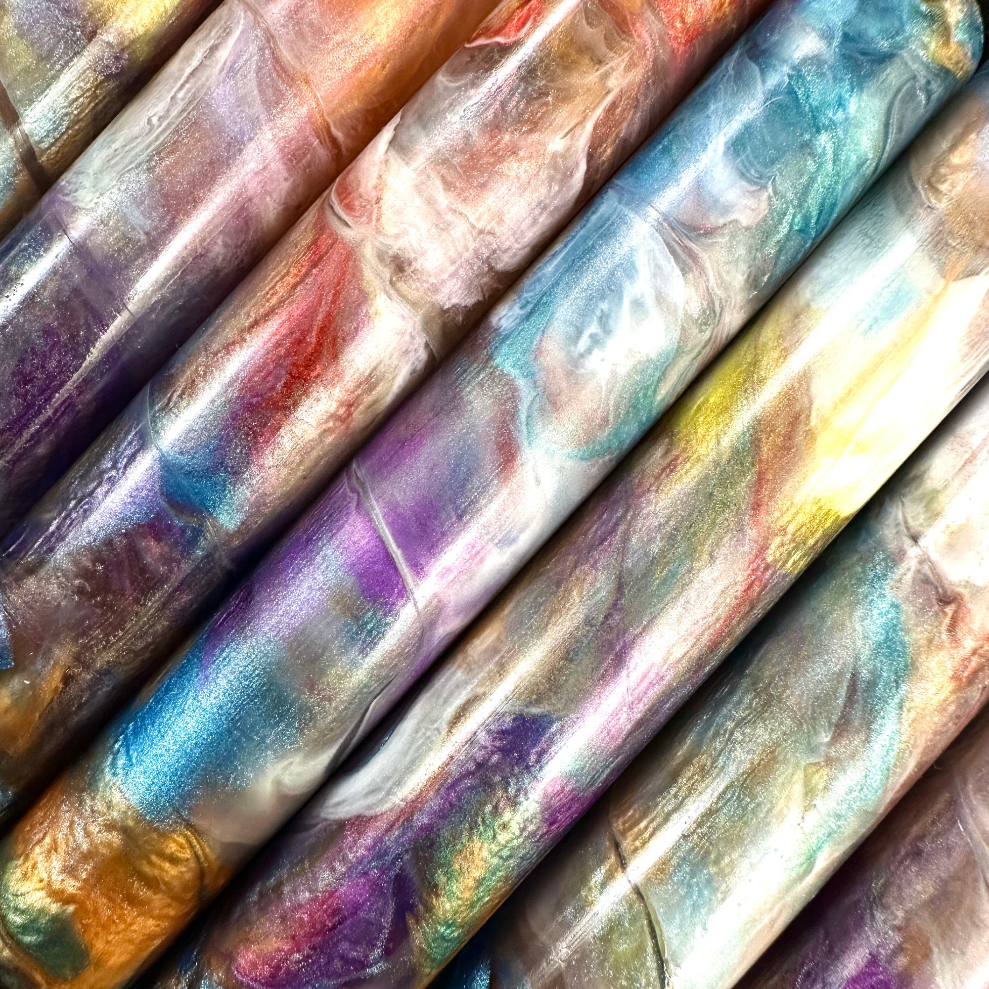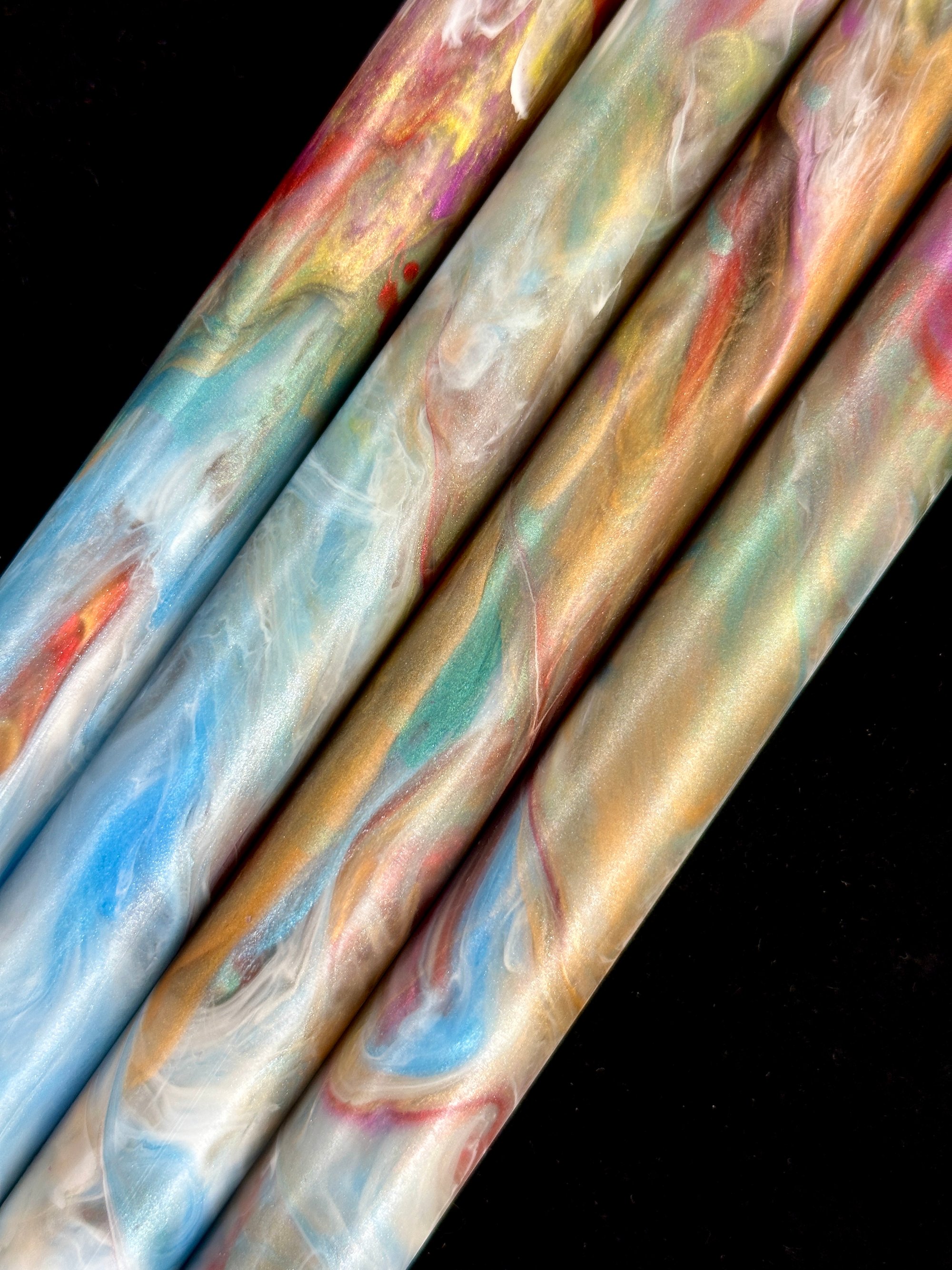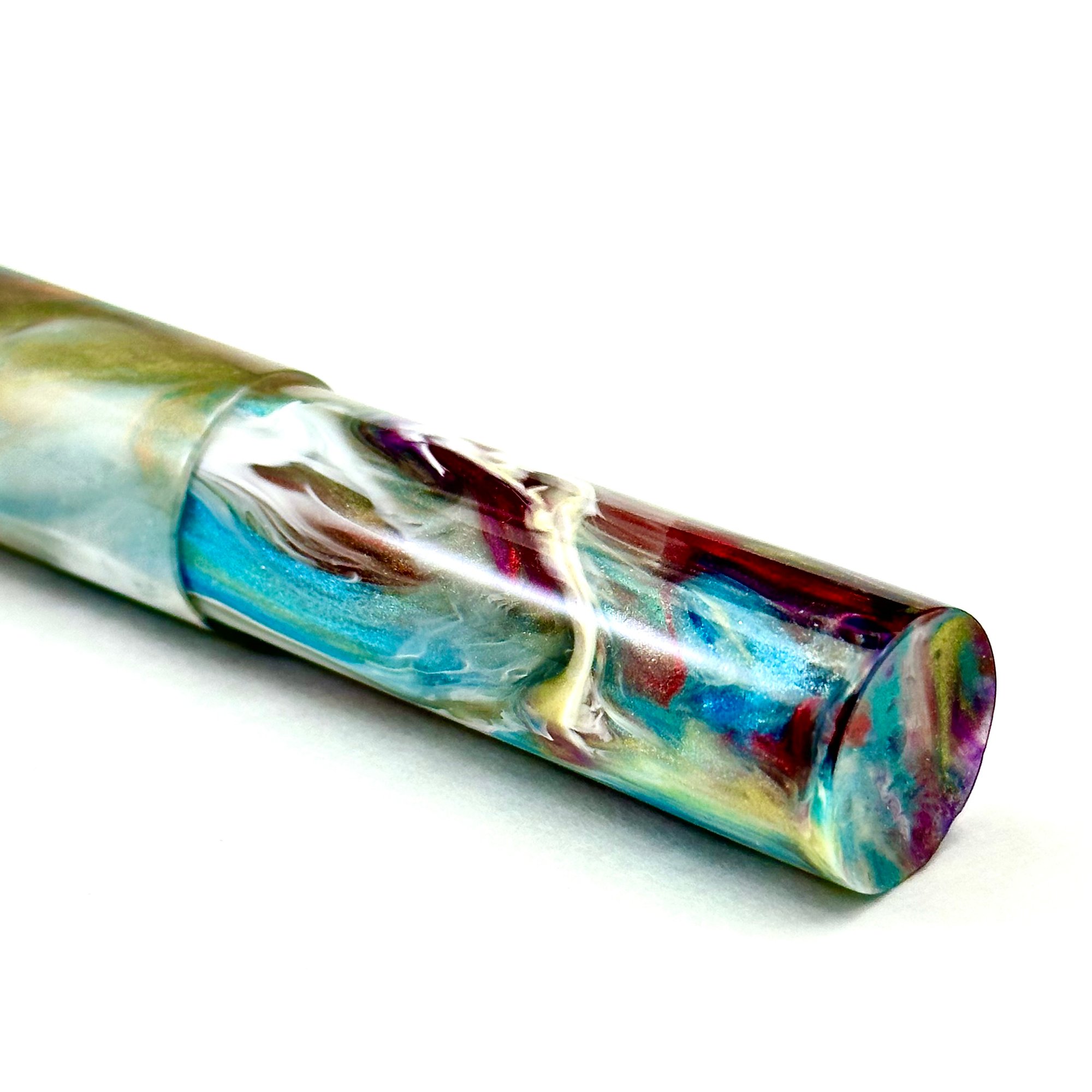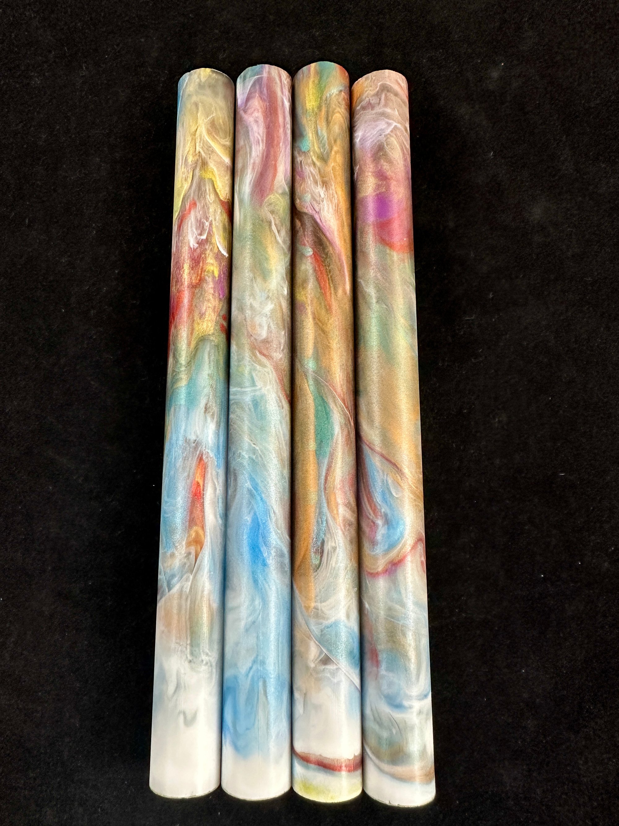'Comfortably Numb', one of a kind custom bespoke pen blanks. High pressure cast and cured with Alumilite Resin® and unique blends of Eye Candy® mica pigments. 'Comfortably Numb' includes several shades of green, gold, purple, yellow, red, blue and opaque white. Made in small batches. These are exclusive, top of the line blanks we offer to custom pen makers. Perfect for the high end fountain pen maker, but would also look fantastic on a kit pen.