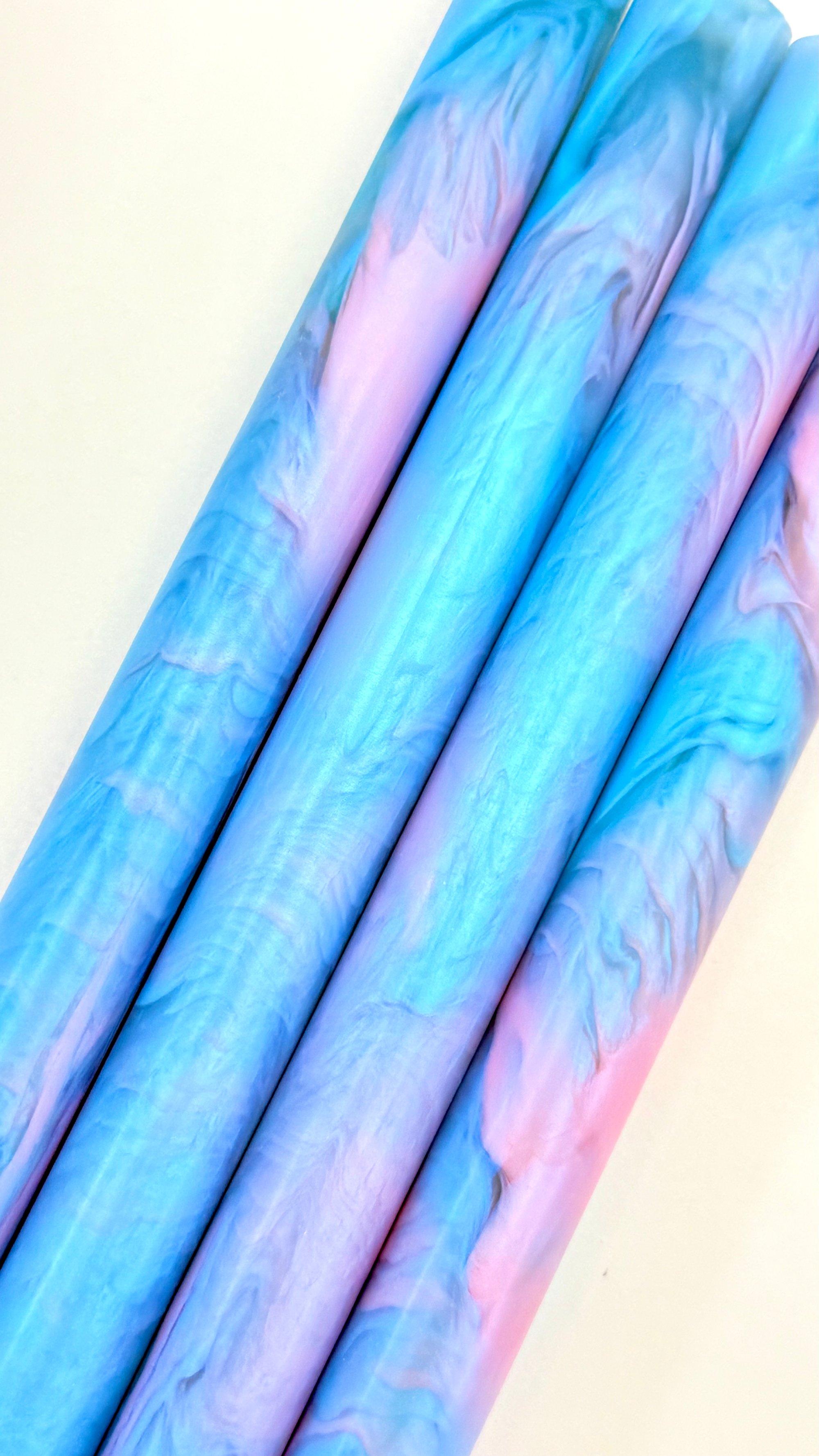 Premium, one of a kind pen blanks. High pressure cast and cured with Alumilite Resin®. 'County Fair' is cast using pastel shades of blue, and pink lightly swirled in with clear resin. Colors reminiscent of cotton candy filled days at the County Fair. Cast in small batches and made for custom pen makers in mind, but also taking into consideration other hand-made craft Makers who require one of a kind, high end materials for their craft. This is it!