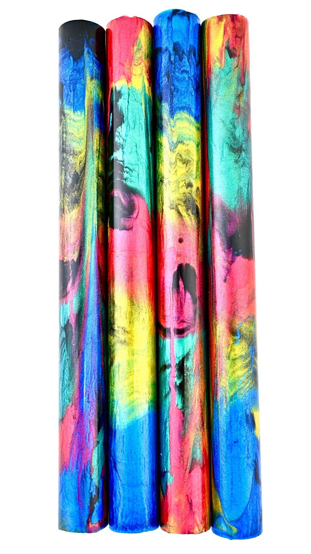 Premium, one of a kind custom bespoke pen blanks. High pressure cast and cured with Alumilite Resin® and unique blends of Eye Candy® mica pigments. Limited Edition 'Go Ask Alice' is a beautiful blank with color-shifting red, blue, green, purple and yellow running randomly throughout the blank, highlighted by opaque black with tiny rainbow crystals. Made in small batches. These are exclusive, top of the line blanks we offer to custom pen makers. Perfect for the high end fountain pen maker, but would also look fantastic on a kit pen. A great blank for any Maker of fine crafts.