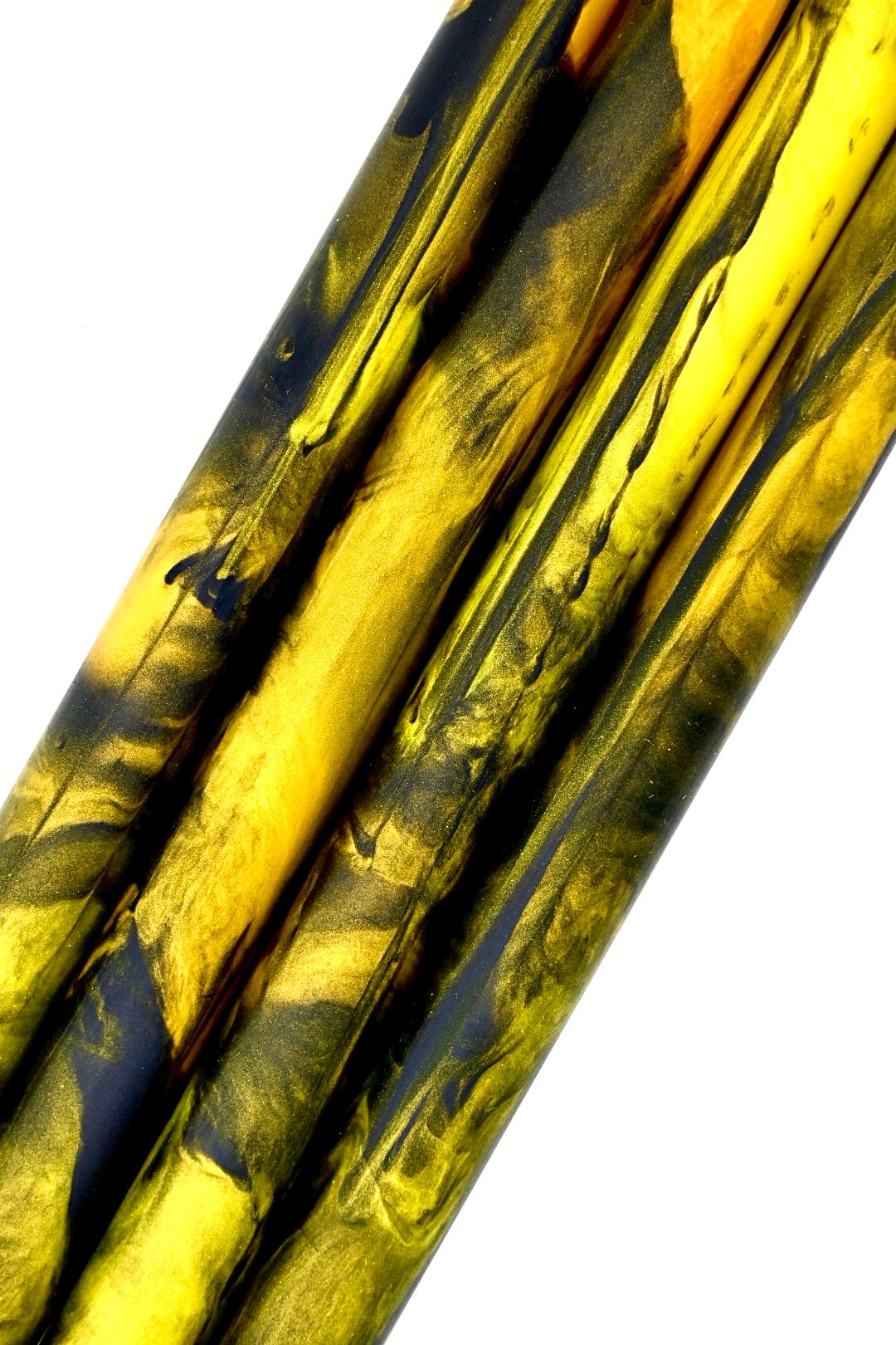 Premium, one of a kind custom bespoke pen blanks. High pressure cast and cured with Alumilite Resin® and unique blends of Eye Candy® mica pigments. 'Golden Rod' includes several shades of yellow, gold and black. Made in small batches. These are exclusive, top of the line blanks we offer to custom pen makers. Perfect for the high end fountain pen maker, but would also look fantastic on a kit pen.