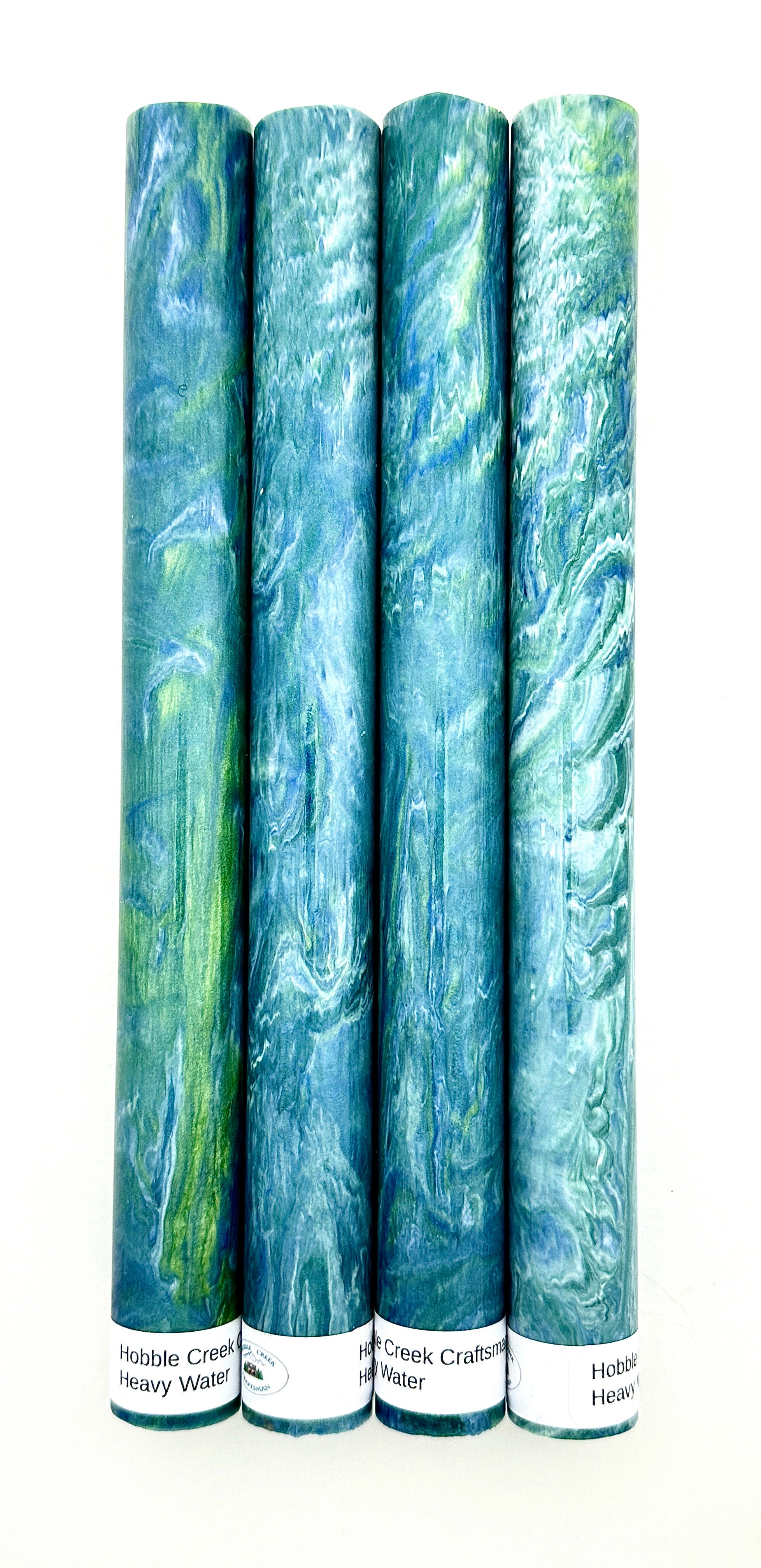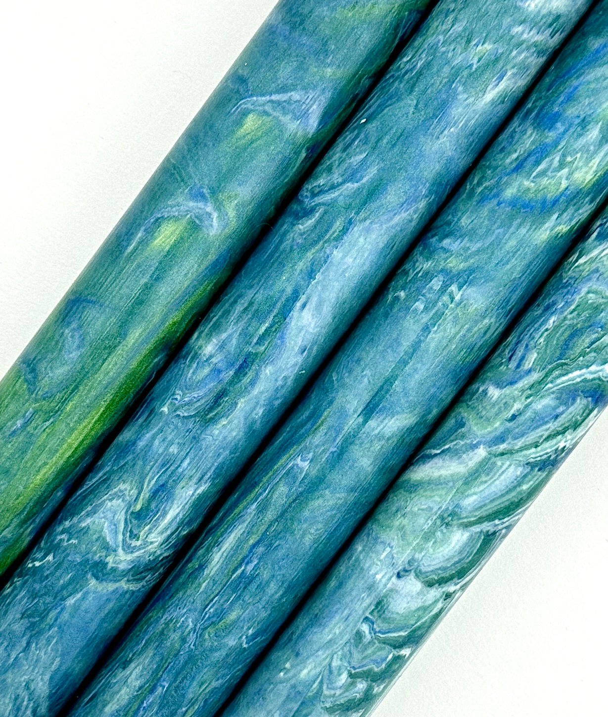 Premium, one of a kind custom bespoke pen blanks. High pressure cast and cured with Alumilite Resin® and unique blends of Eye Candy® mica pigments. 'Heavy Water' includes several shades blue, green and opaque white. Made in small batches. These are exclusive, top of the line blanks we offer to custom pen makers. Perfect for the high end fountain pen maker, but would also look fantastic on a kit pen.