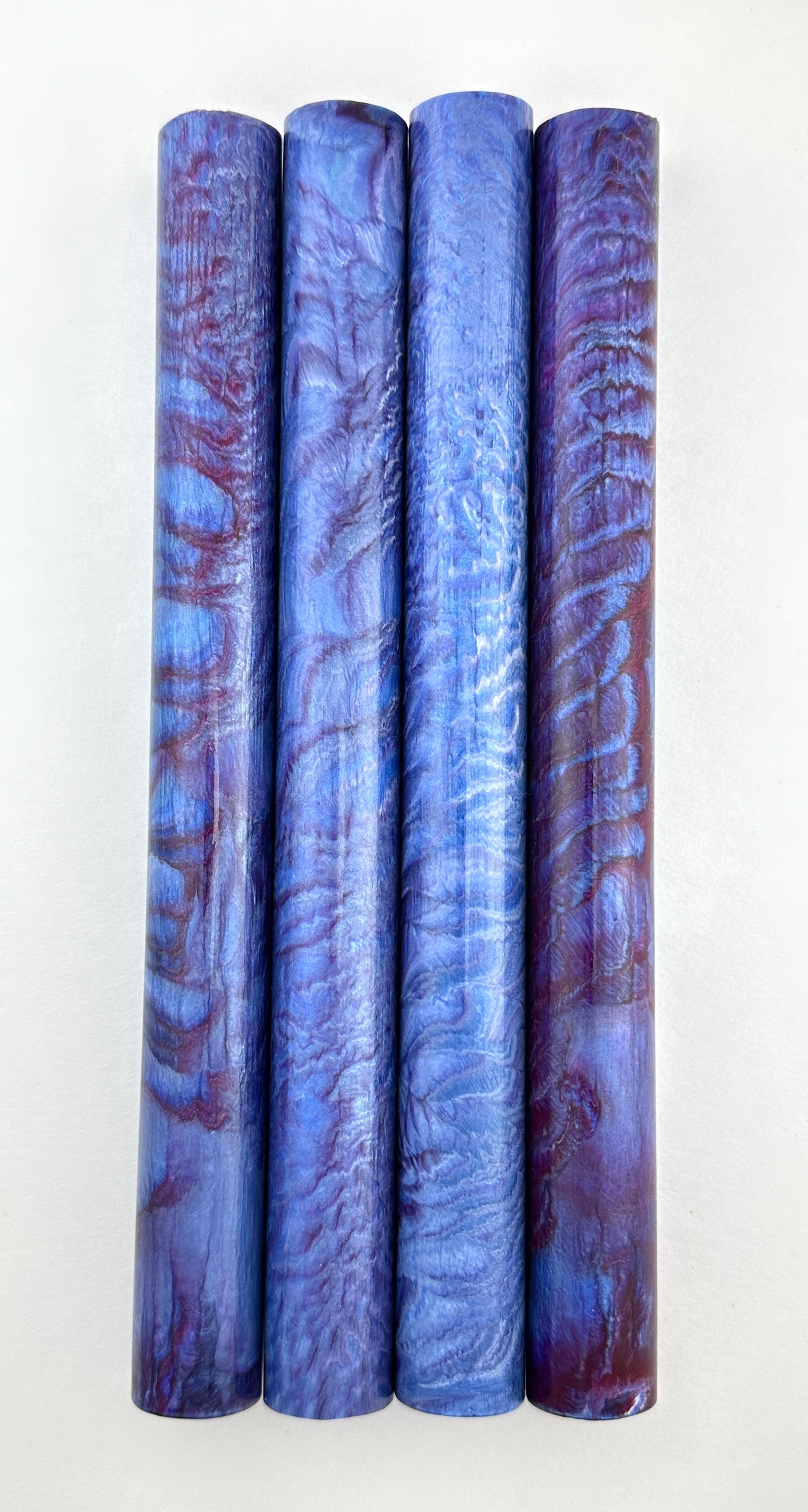 Premium, one of a kind custom bespoke pen blanks. High pressure cast and cured with Alumilite Resin® and unique blends of Eye Candy® mica pigments. 'Into The Blue' includes several color shades, including sangria purple, blue and opaque white. Made in small batches. These are exclusive, top of the line blanks we offer to custom pen makers. Perfect for the high end fountain pen maker, but would also look fantastic on a kit pen.
