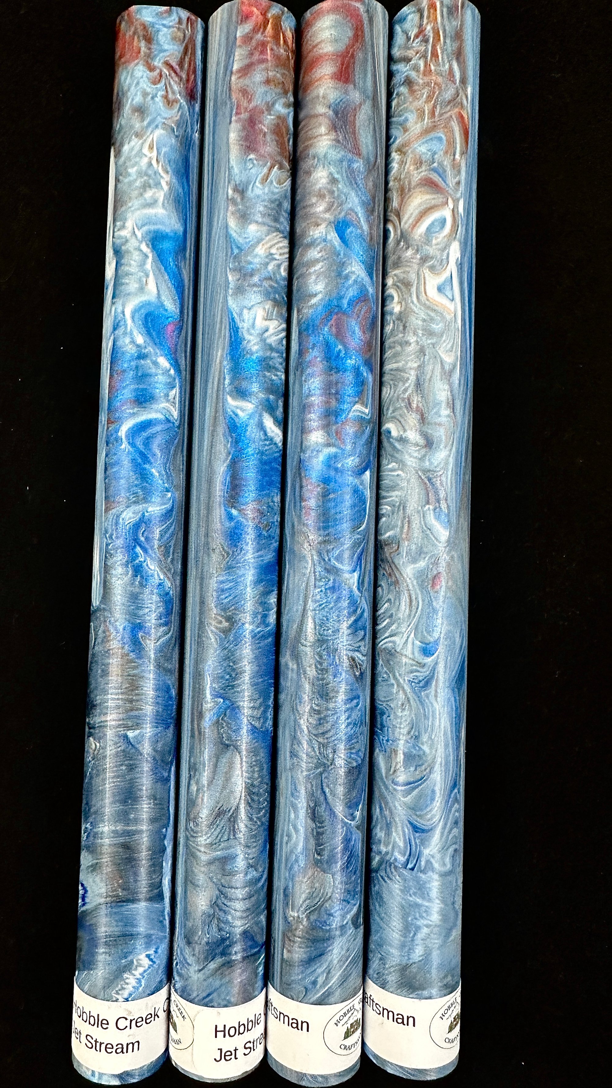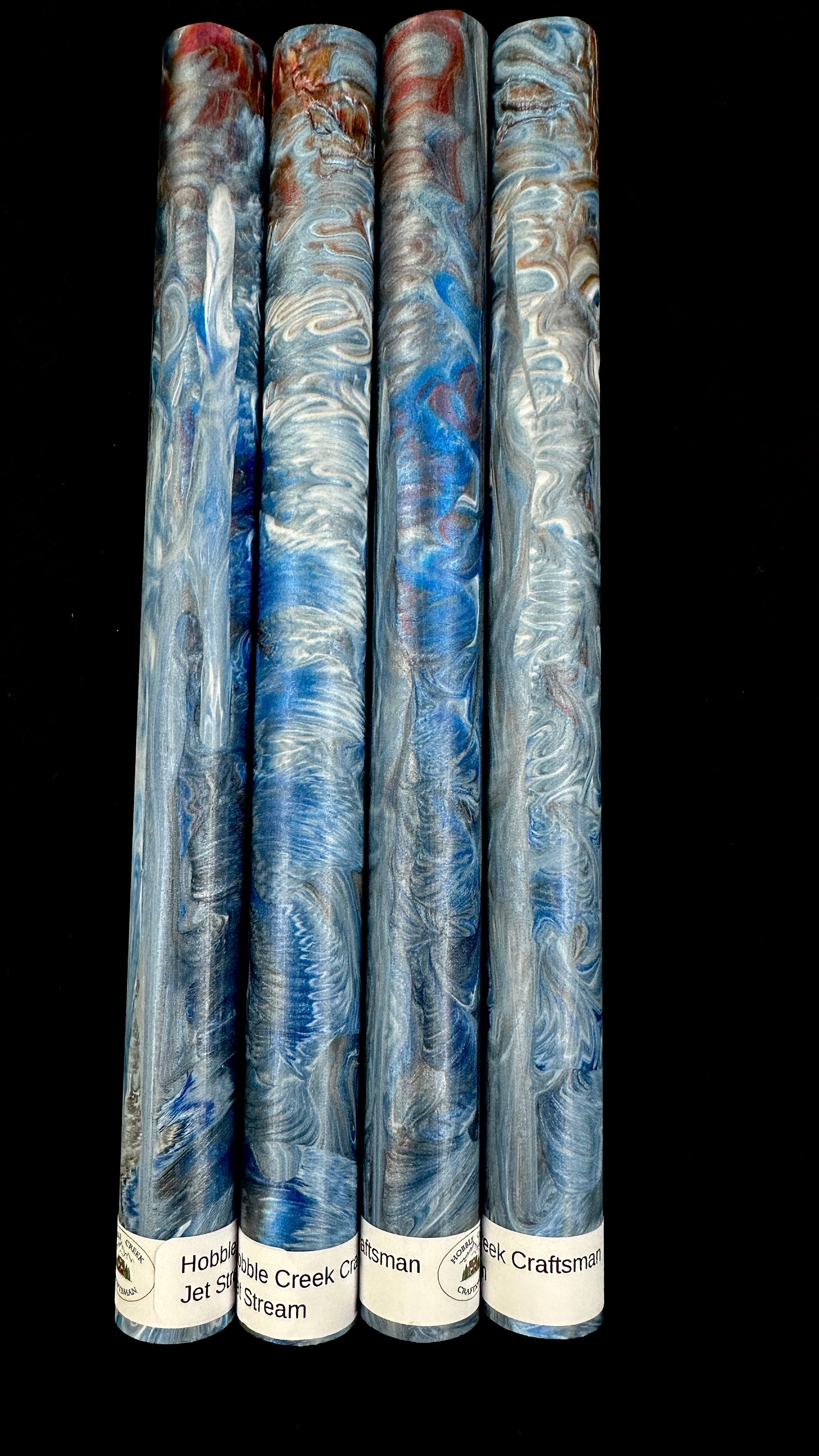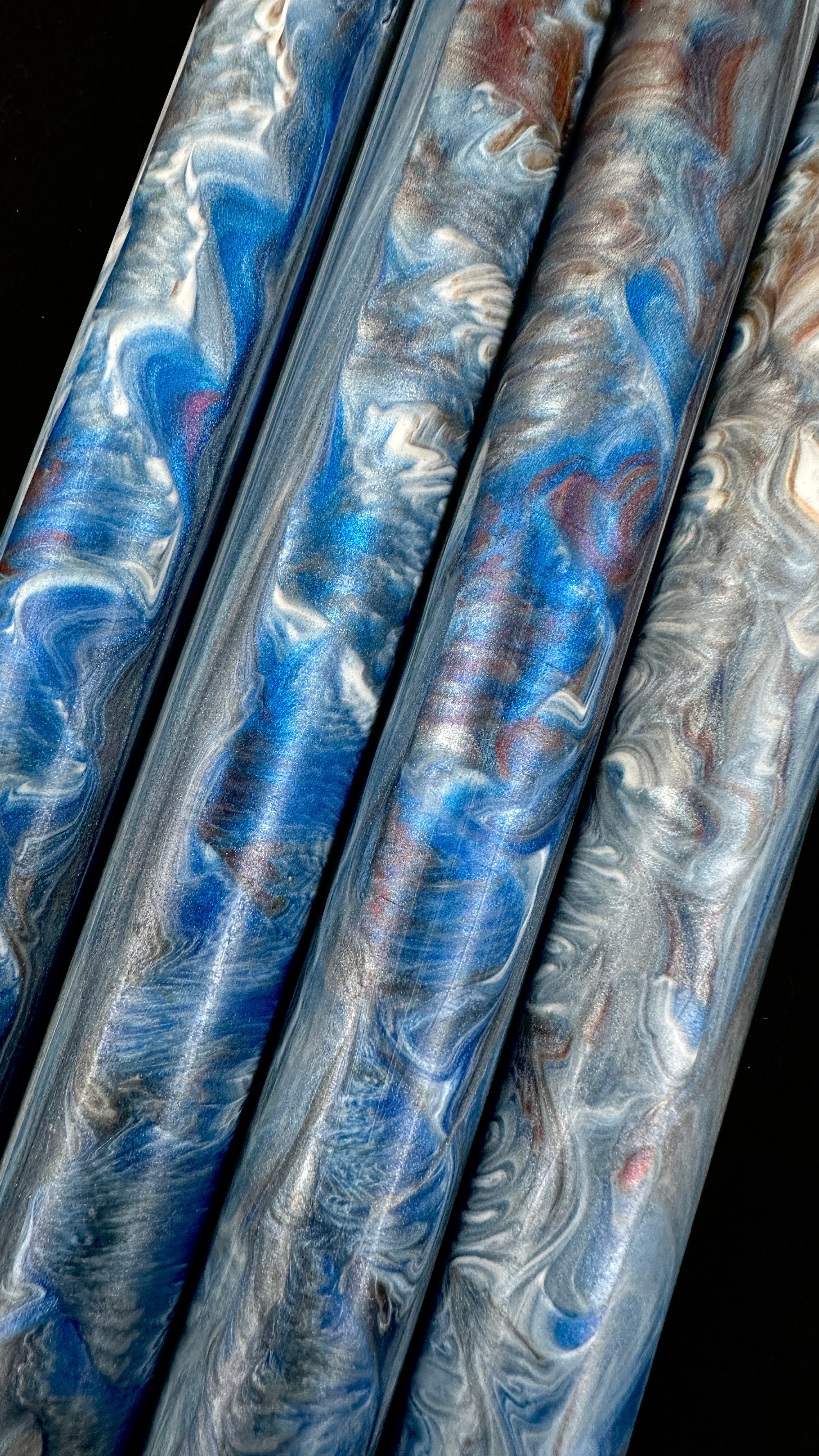 Premium, one of a kind custom bespoke pen blanks. High pressure cast and cured with Alumilite Resin® and unique blends of Eye Candy® mica pigments. 'Jet Stream' includes several shades of blue, red/blue color shifts and opaque white. Made in small batches. These are exclusive, top of the line blanks we offer to custom pen makers. Perfect for the high end fountain pen maker, but would also look fantastic on a kit pen.