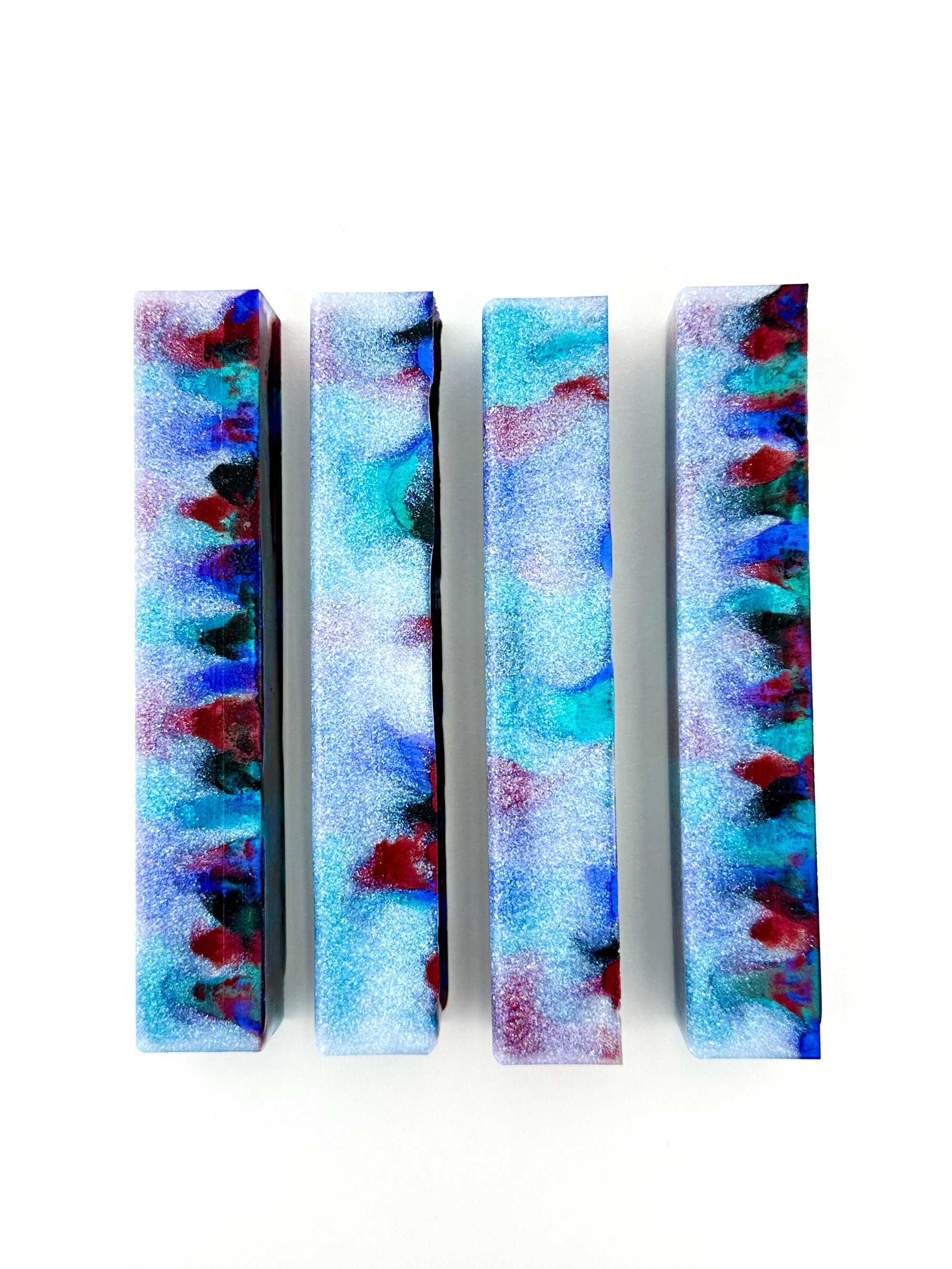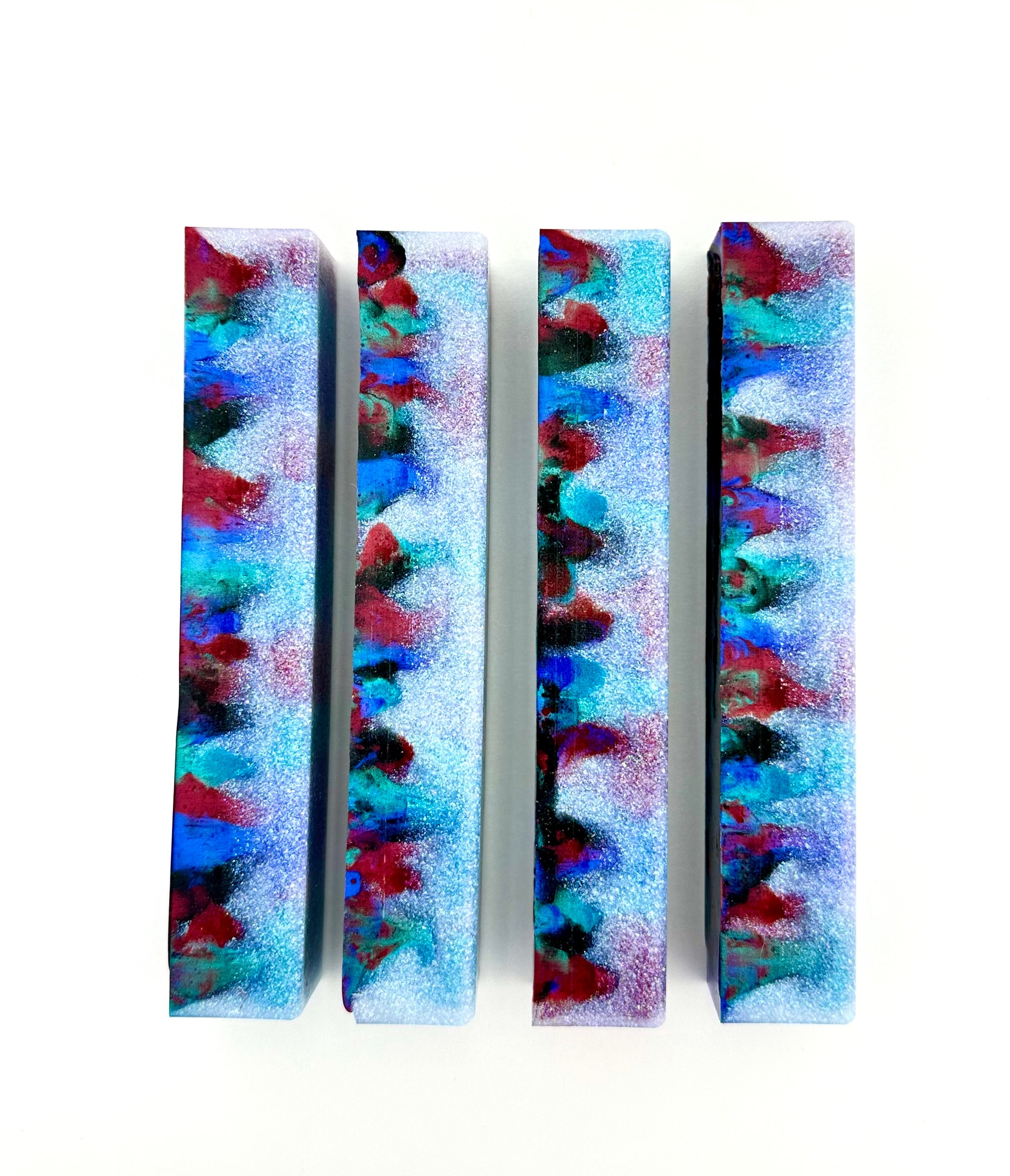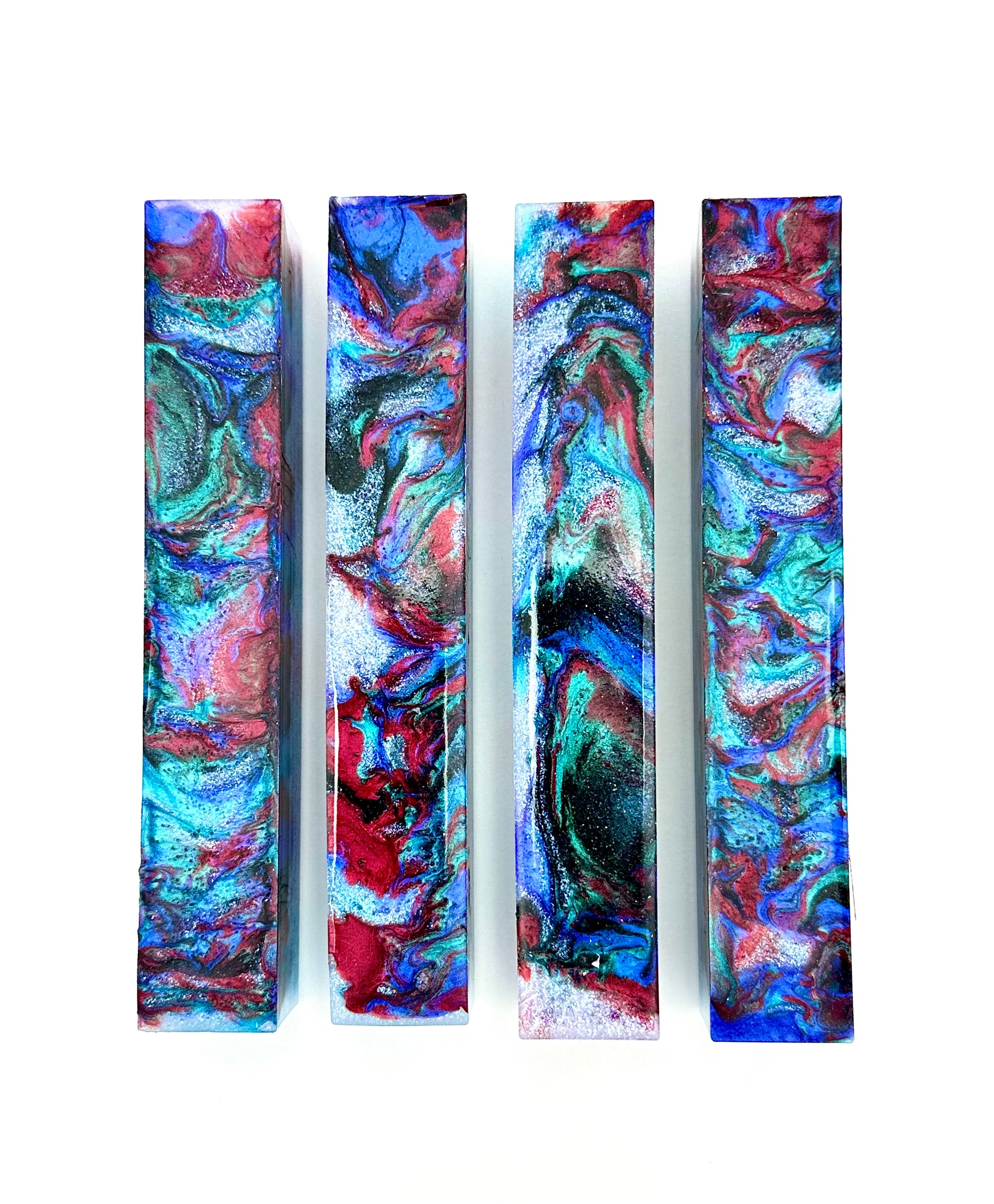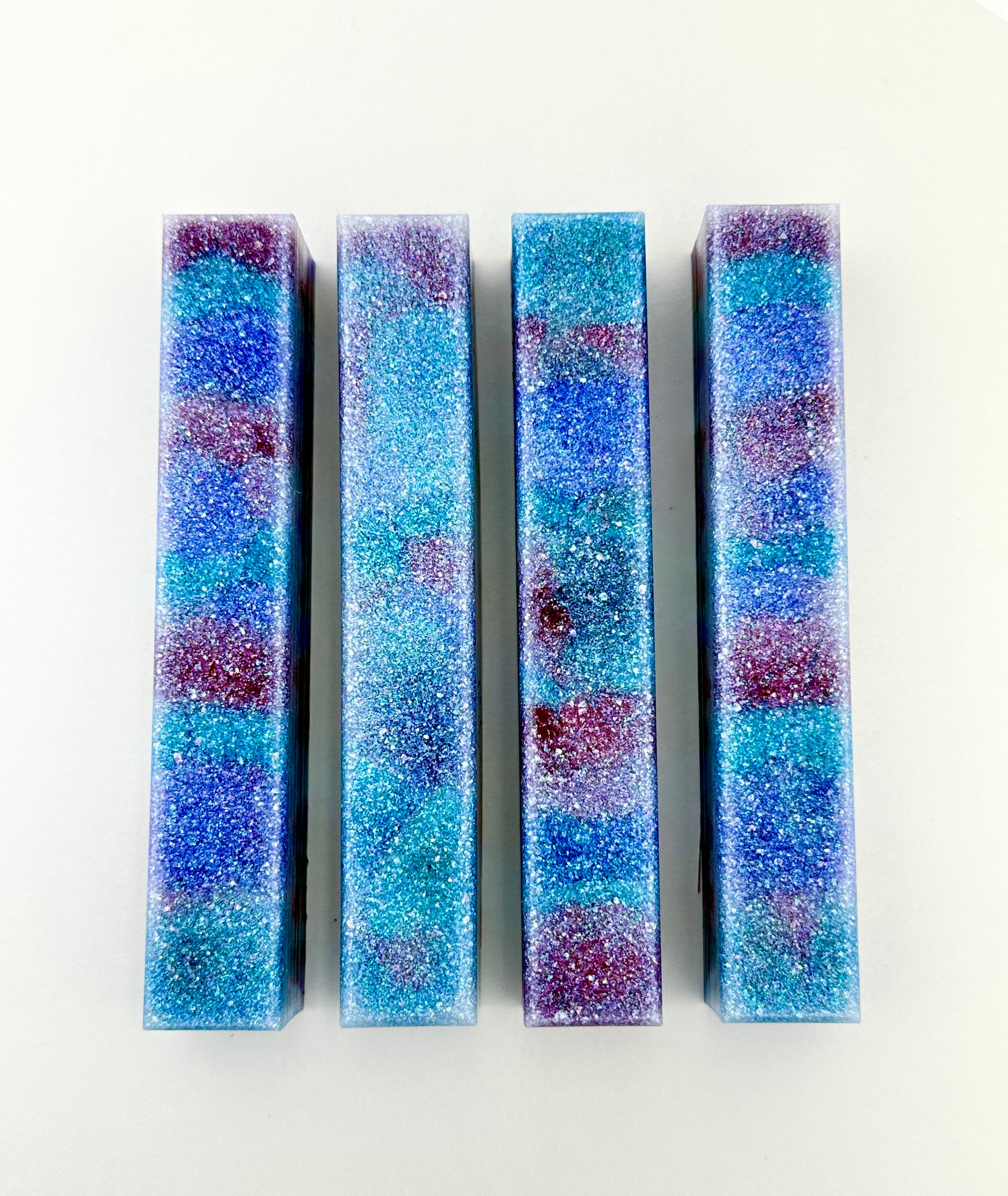 Milky Way Diamond Painting Pen Blanks!! High pressure cast and cured with Eyecandy Pigments® and Alumilite® resin! These are fantastic blanks, with purples, reds, greens and diamond dust poured into clear resin. The dimensions allow for any size pen kit, including the larger ones, but these will work best with no brass tube. Perfect for diamond painting pens. Smooth as butter to turn and polish up like glass.