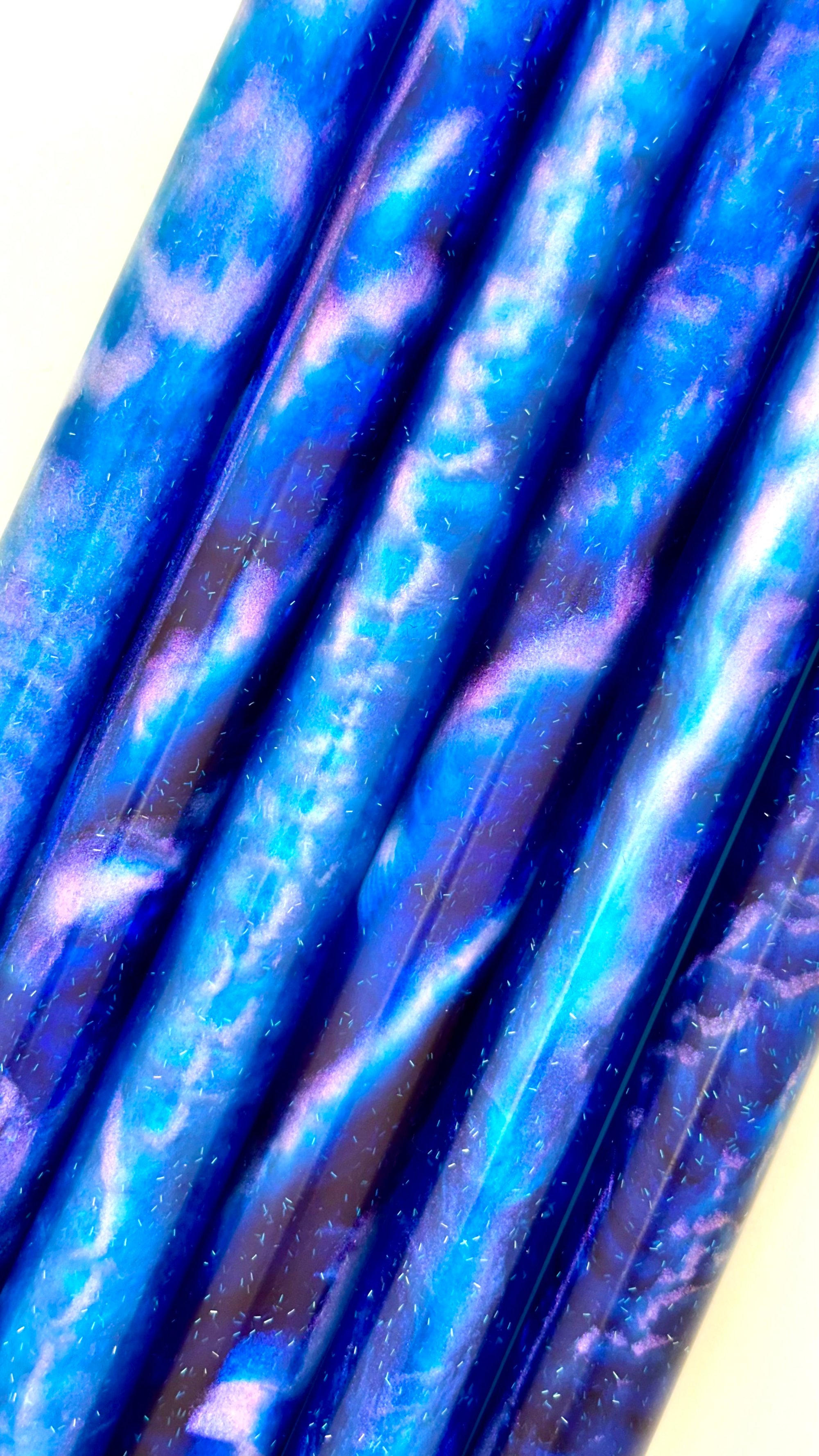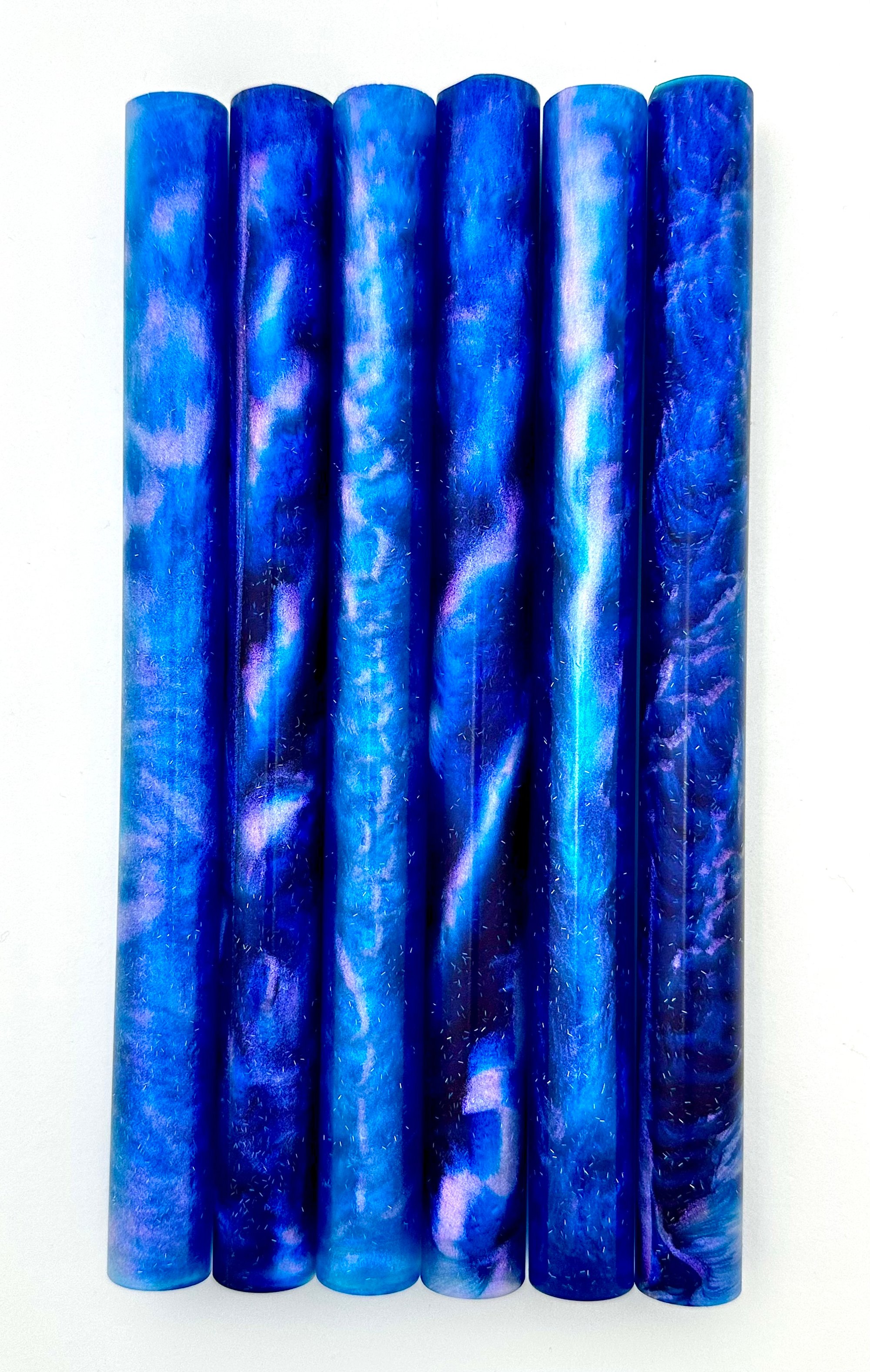Reformulated 'Moon Shadow' is high pressure cast using Alumilite resin, translucent dyes and proprietary color-shift pigments along with holographic shredded glitter. It will definitely hold some beautiful surprises! Made for high end custom fountain pen makers in mind, but also taking into consideration other custom makers who require one of a kind, high end materials for their craft.