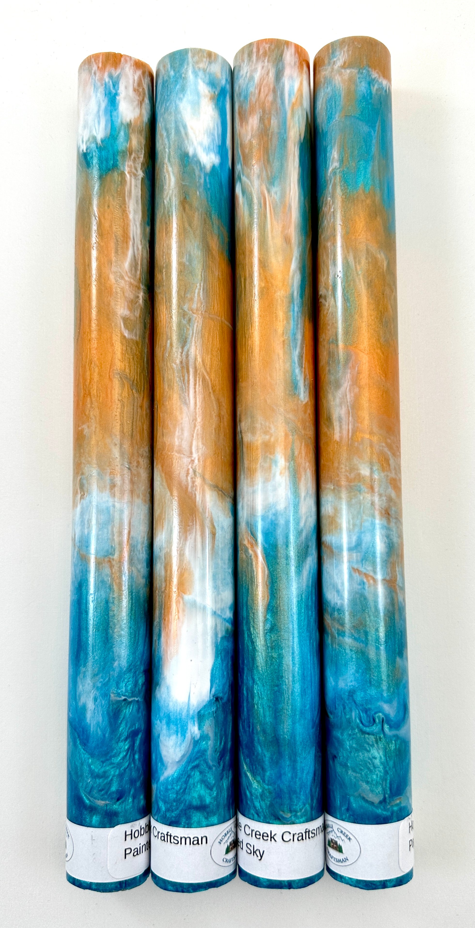 Premium, one of a kind custom bespoke pen blanks. High pressure cast and cured with Alumilite Resin® and unique blends of Eye Candy® mica pigments. 'Painted Sky' includes several shades of blue, orange, teal and opaque white. Made in small batches. These are exclusive, top of the line blanks we offer to custom pen makers. Perfect for the high end fountain pen maker, but would also look fantastic on a kit pen.