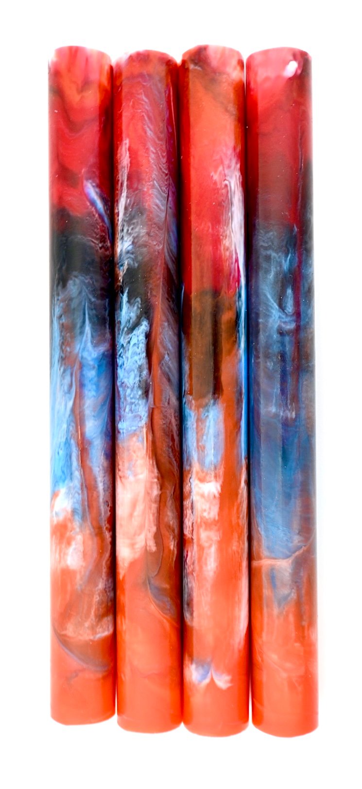 Premium, one of a kind custom bespoke pen blanks. High pressure cast and cured with Alumilite Resin® and unique blends of high quality mica pigments. 'Phoenix Rising' is splashed with the colors representing the Phoenix, rising from the flames of destruction to renewal and strength, including several hues of black, flame reds, oranges and blues. Made in small batches. These are exclusive, top of the line blanks we offer to custom pen makers. Perfect for the high end fountain pen maker, but would also look fantastic on a kit pen.