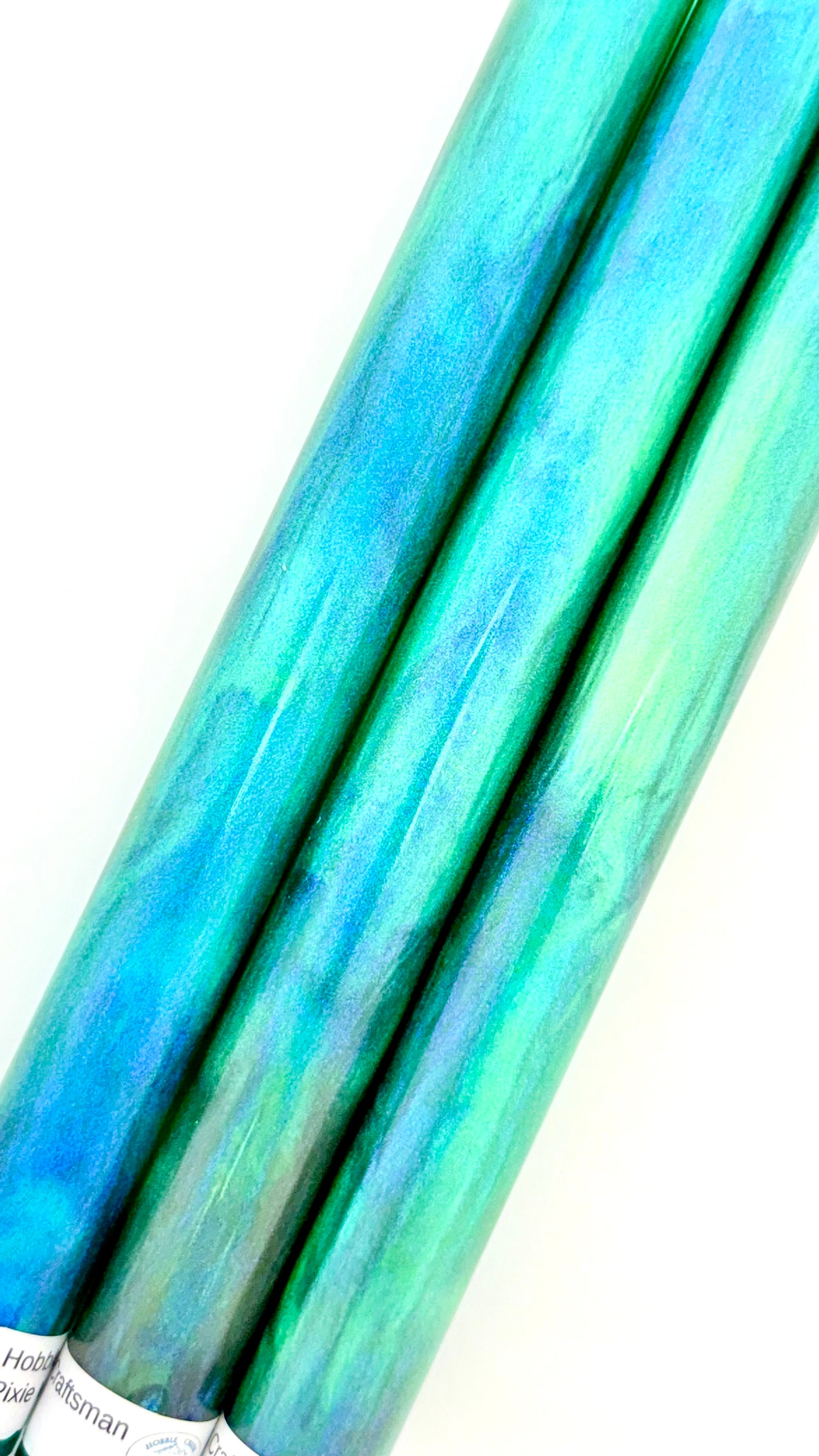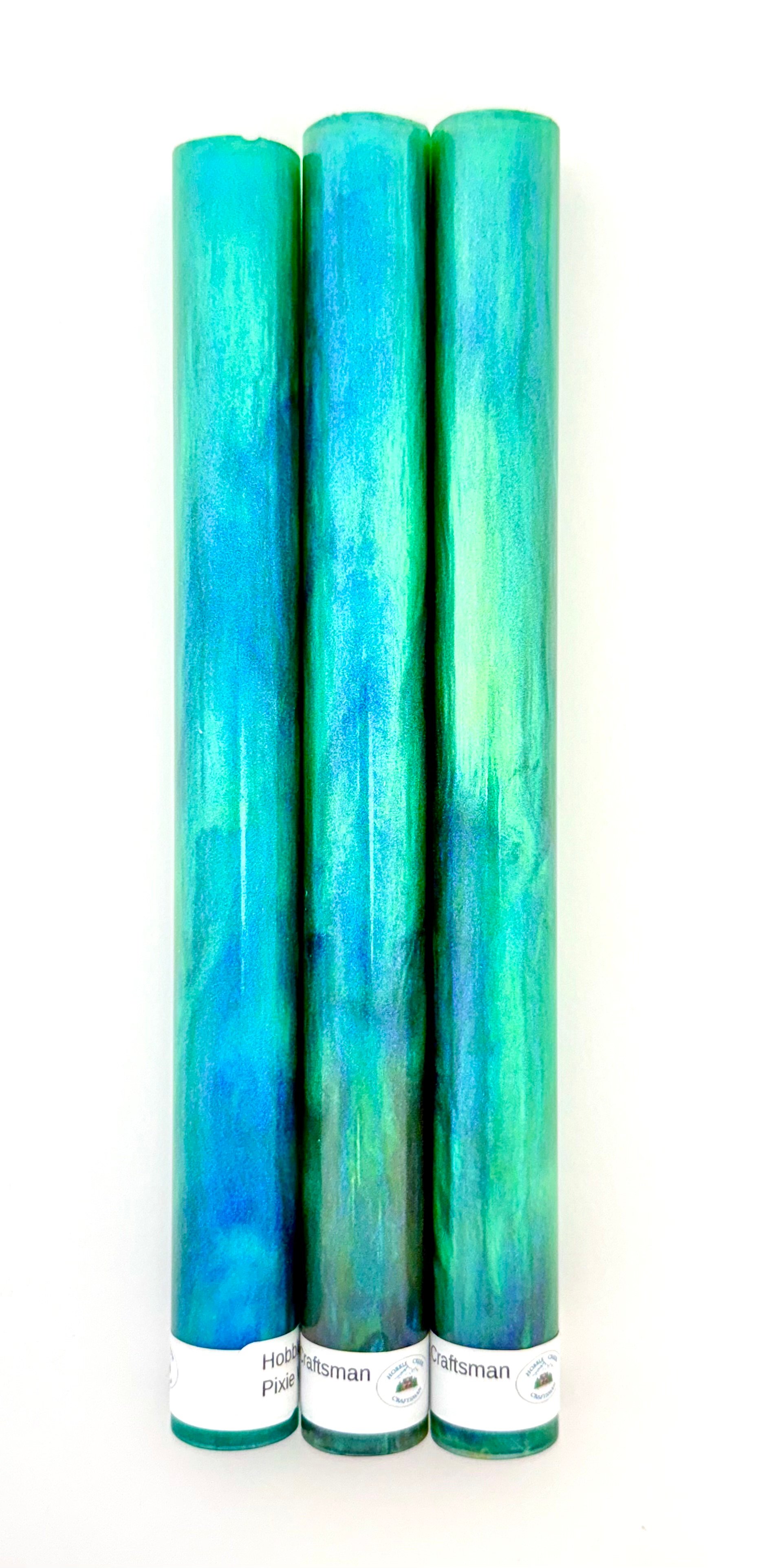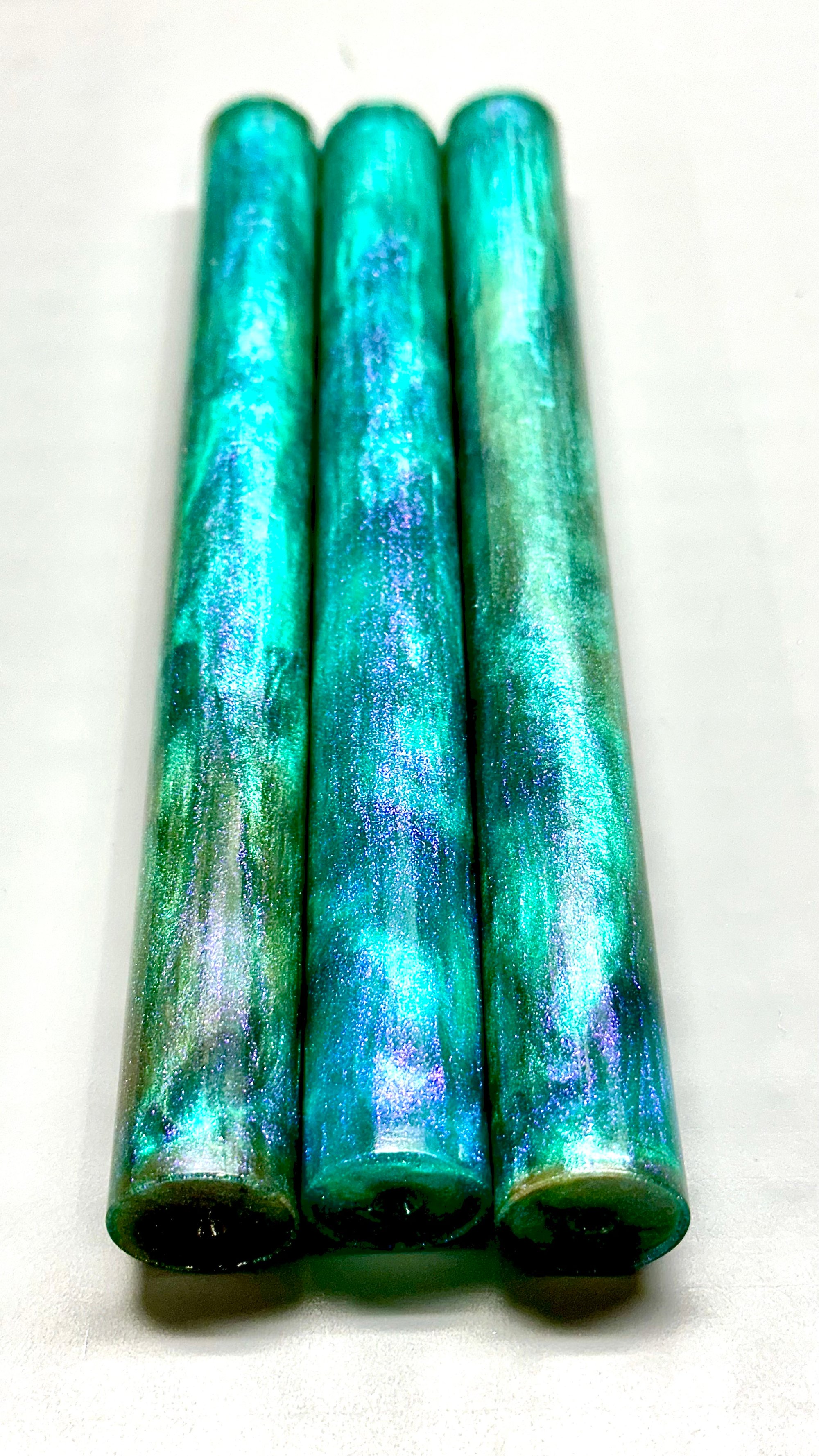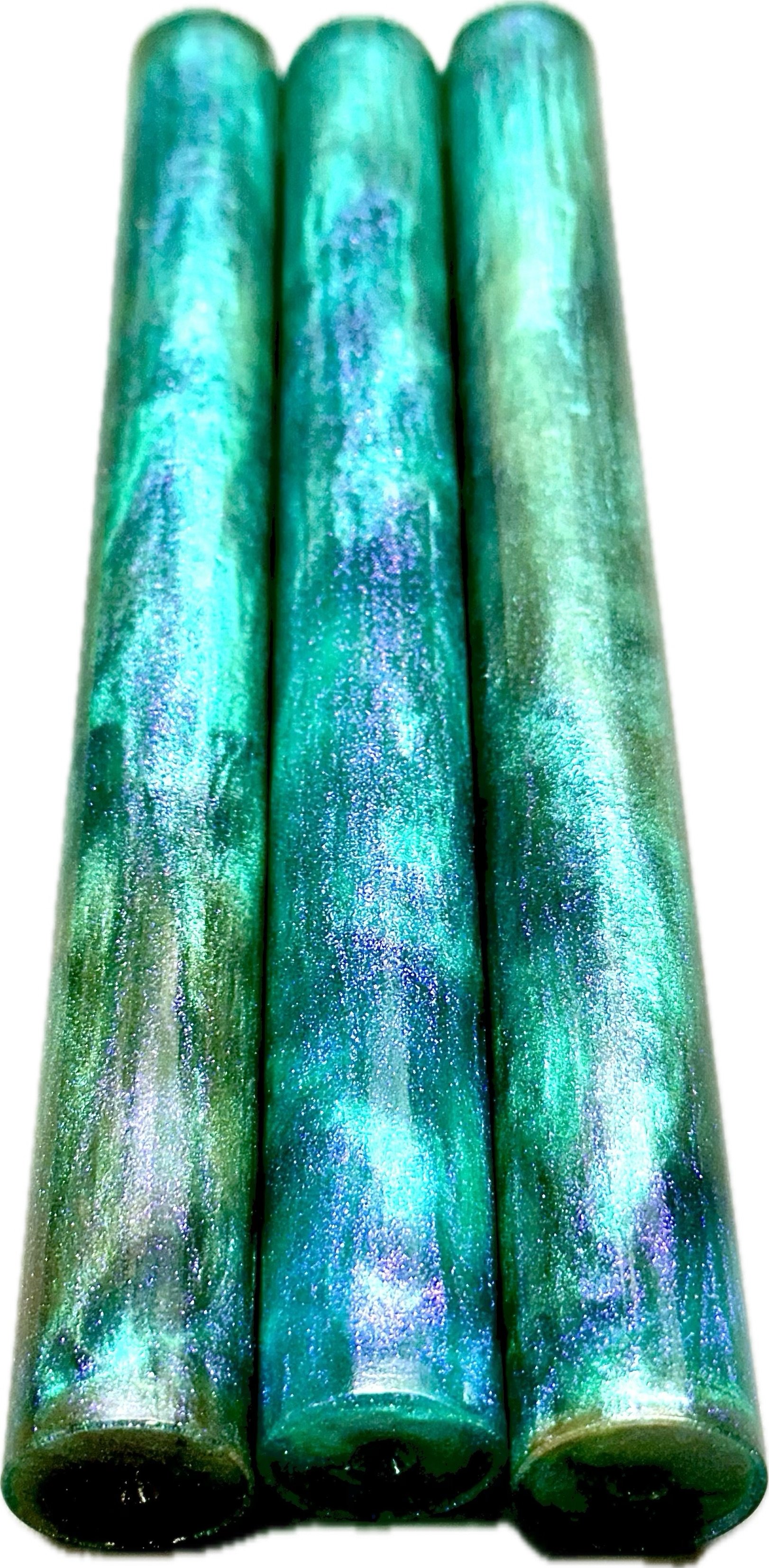 Premium, one of a kind custom bespoke pen blanks. High pressure cast and cured with Alumilite Resin®. Very rare and Limited Edition, 'Pixie Wings' is a great mix of high grade pigments and dyes, including several shades of ethereal & aurora color-shifting pigments that have been discontinued, along with complimentary translucent colors. Made in small batches, these are exclusive, top of the line blanks we offer with high end fountain pen makers in mind, but they're also great for any maker looking for unique material. Only three available in this mix!