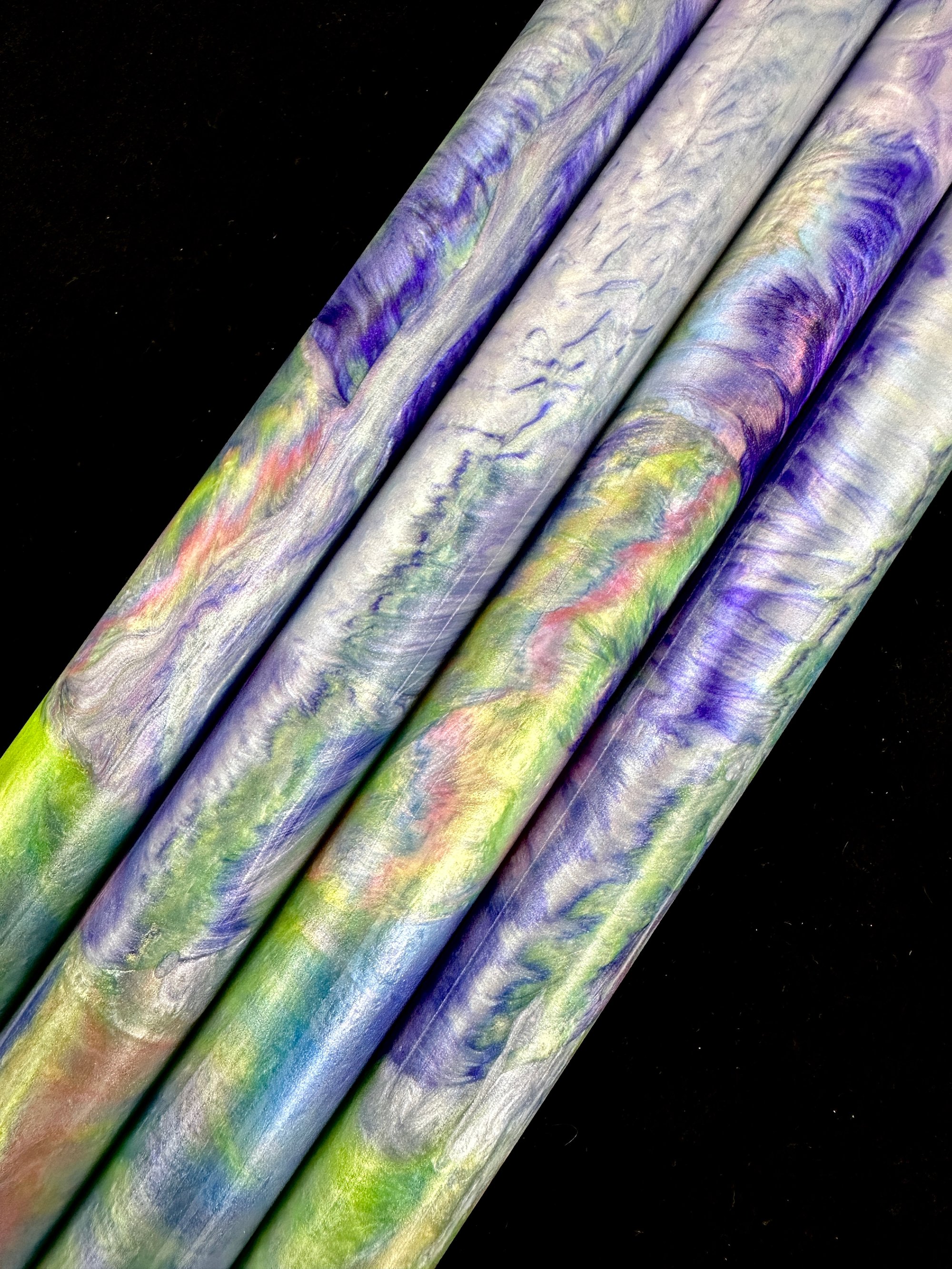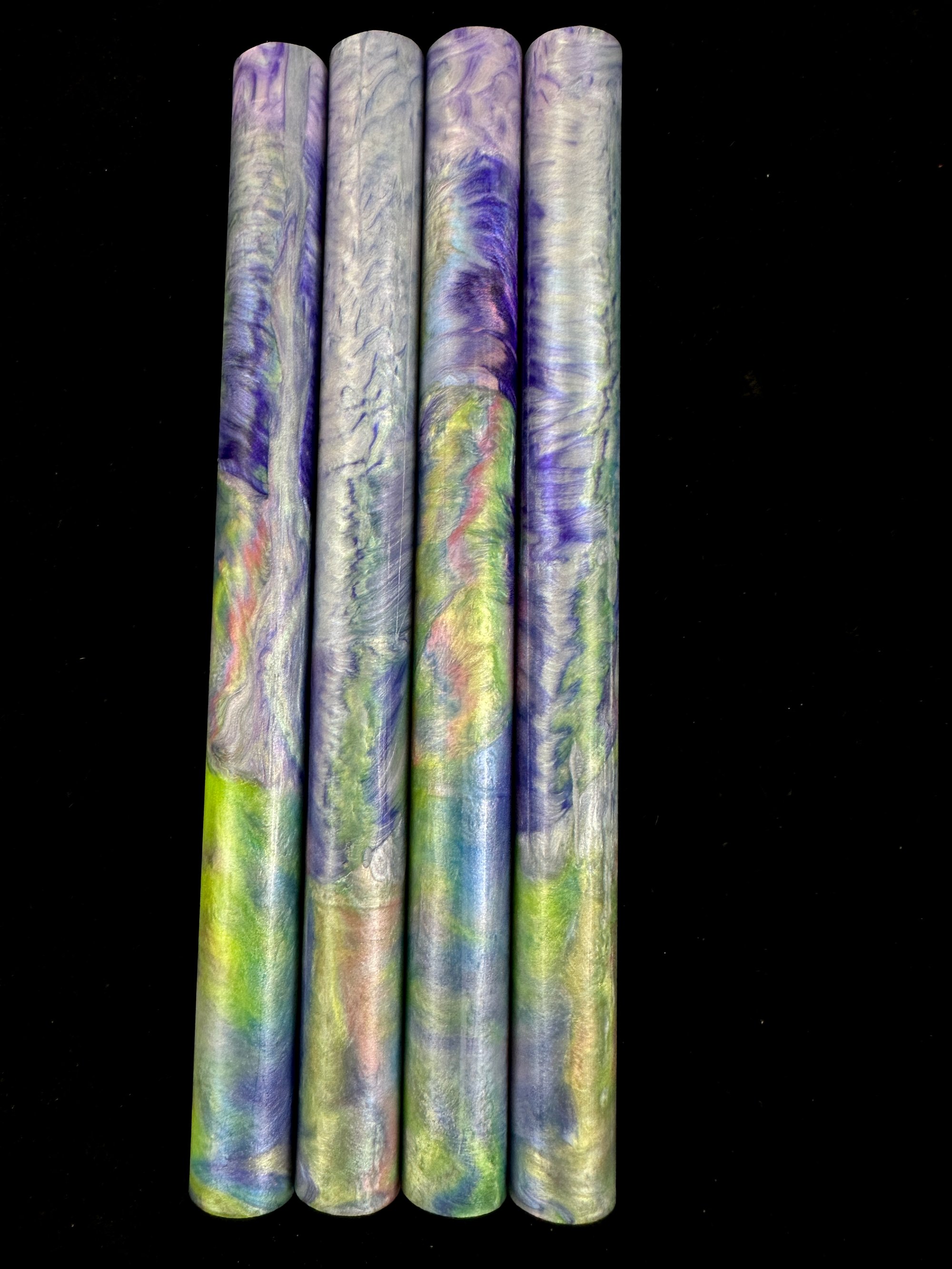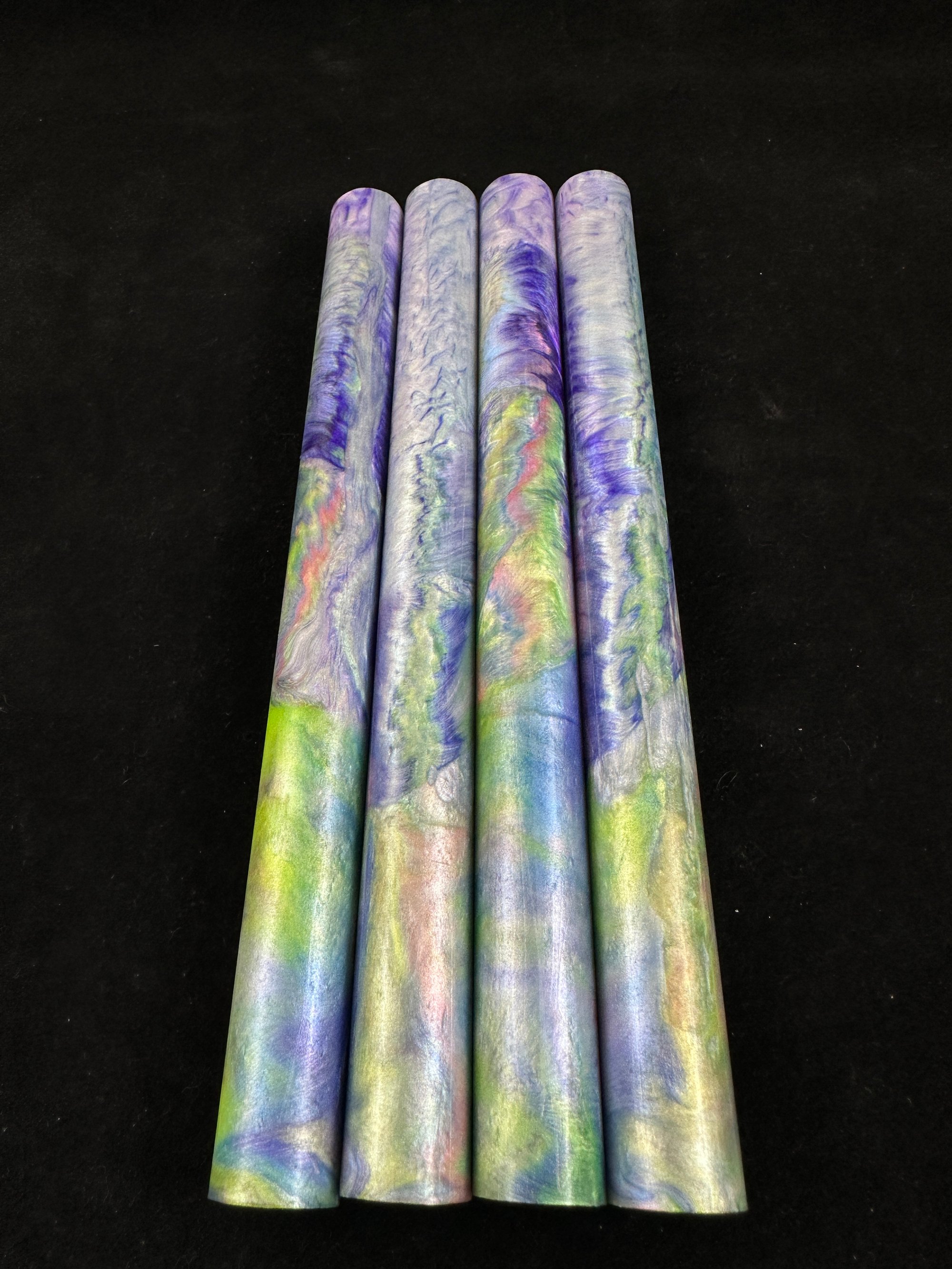 Premium, one of a kind custom bespoke pen blanks. High pressure cast and cured with Alumilite Resin® and unique blends of Eye Candy® mica pigments. 'Prismatic' is a light bending blank, with florescent colors of red, yellow, green, blue and purple running throughout the blank. Made in small batches. These are exclusive, top of the line blanks we offer to custom pen makers. Perfect for the high end fountain pen maker, but would also look fantastic on a kit pen.