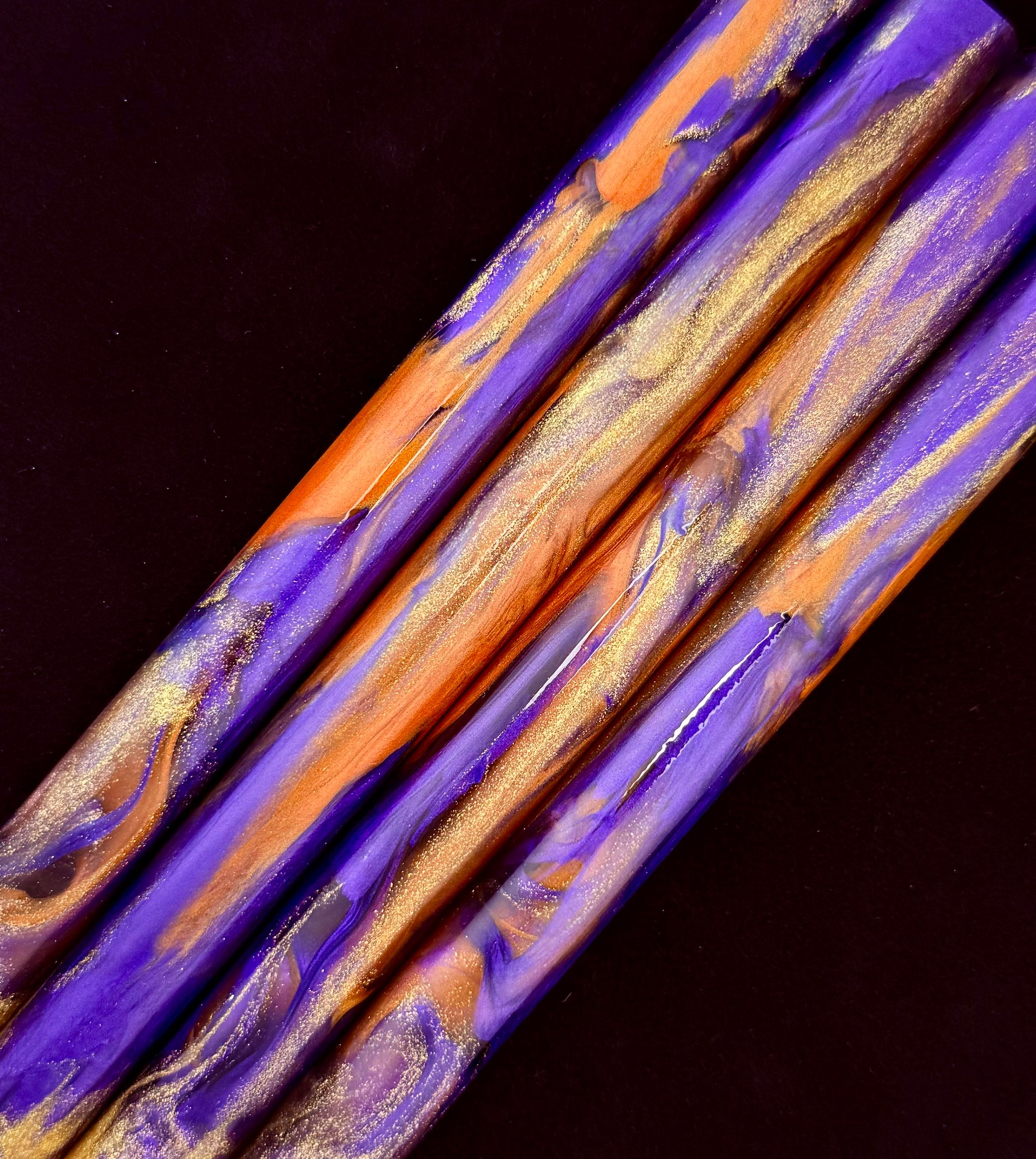 Rare Bear, custom one of a kind custom bespoke pen blanks. High pressure cast and cured with Alumilite Resin® and unique blends of Eye Candy® mica pigments. 'Rare Bear' includes several shades of purple, gold, orange and opaque white. This is a salute to the former Reno Air Racer, 'Rare Bear' and its color combinations. Made in small batches. These are exclusive, top of the line blanks we offer to custom pen makers. Perfect for the high end fountain pen maker, but would also look fantastic on a kit pen.