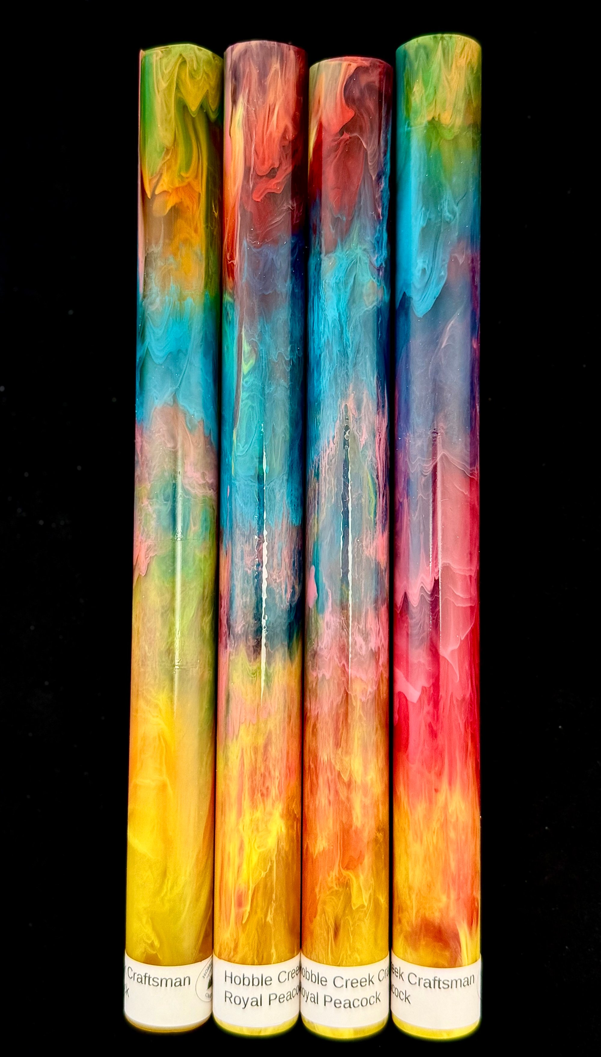 Premium, one of a kind custom bespoke pen blanks. High pressure cast and cured with Alumilite Resin®. 'Royal Peacock' is a great combination of translucent red, teal and yellow mixed with opaque and pastel red, pastel teal and pastel yellow internally, which makes for a beautiful blank! Made in small batches, these are exclusive, top of the line blanks we offer to custom pen makers. Perfect for the high end fountain pen Maker, or any Maker of fine handmade crafts.