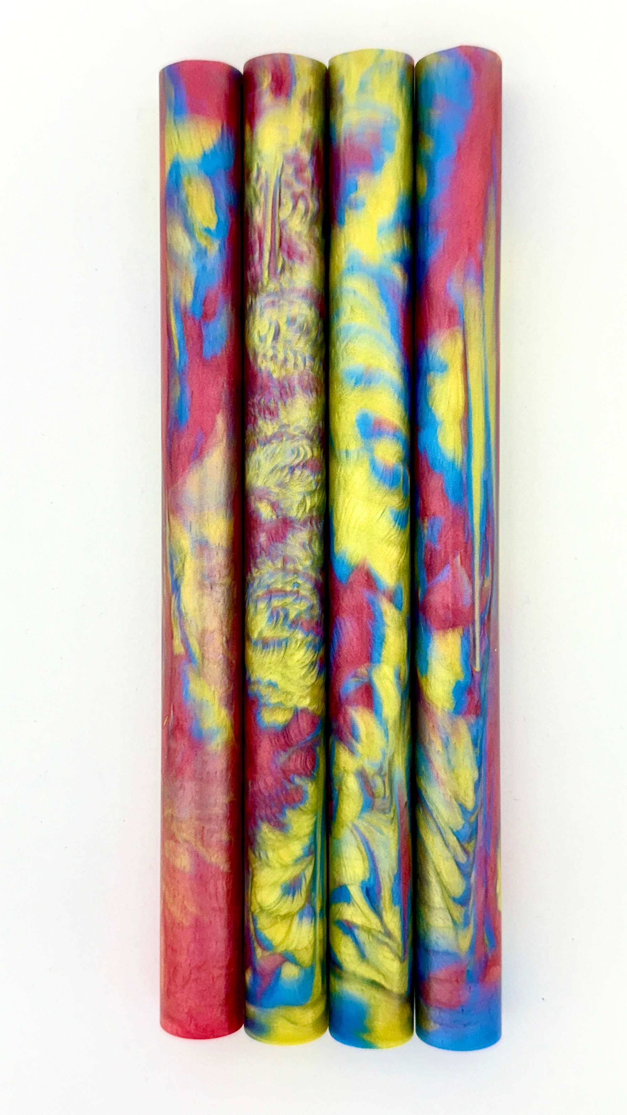 Custom Bespoke Makers Blank! 'Summer Solstice' is high pressure cast using Alumilite resin, translucent dyes mixed in with their matching ghost pigments. The end result is a blank that captures light with shimmering brilliance, casting it back out with double the color! High pressure cast in small batches and made for custom pen makers in mind, but also taking into consideration other hand-made craft Makers who require one of a kind, high end materials for their craft. This is it!
