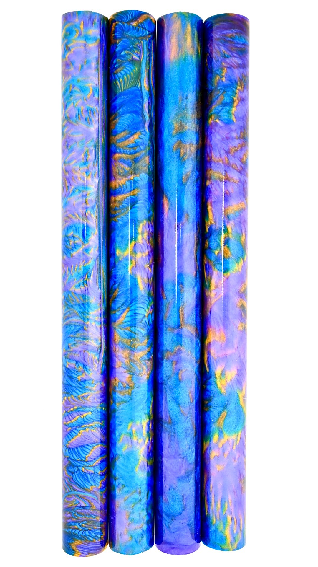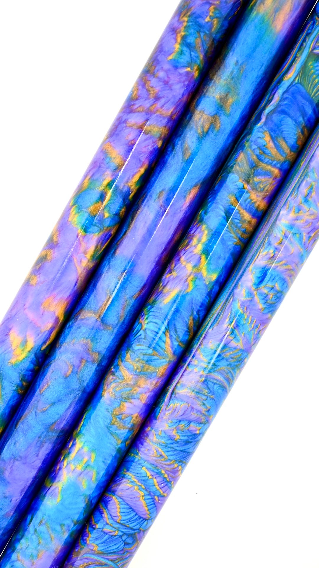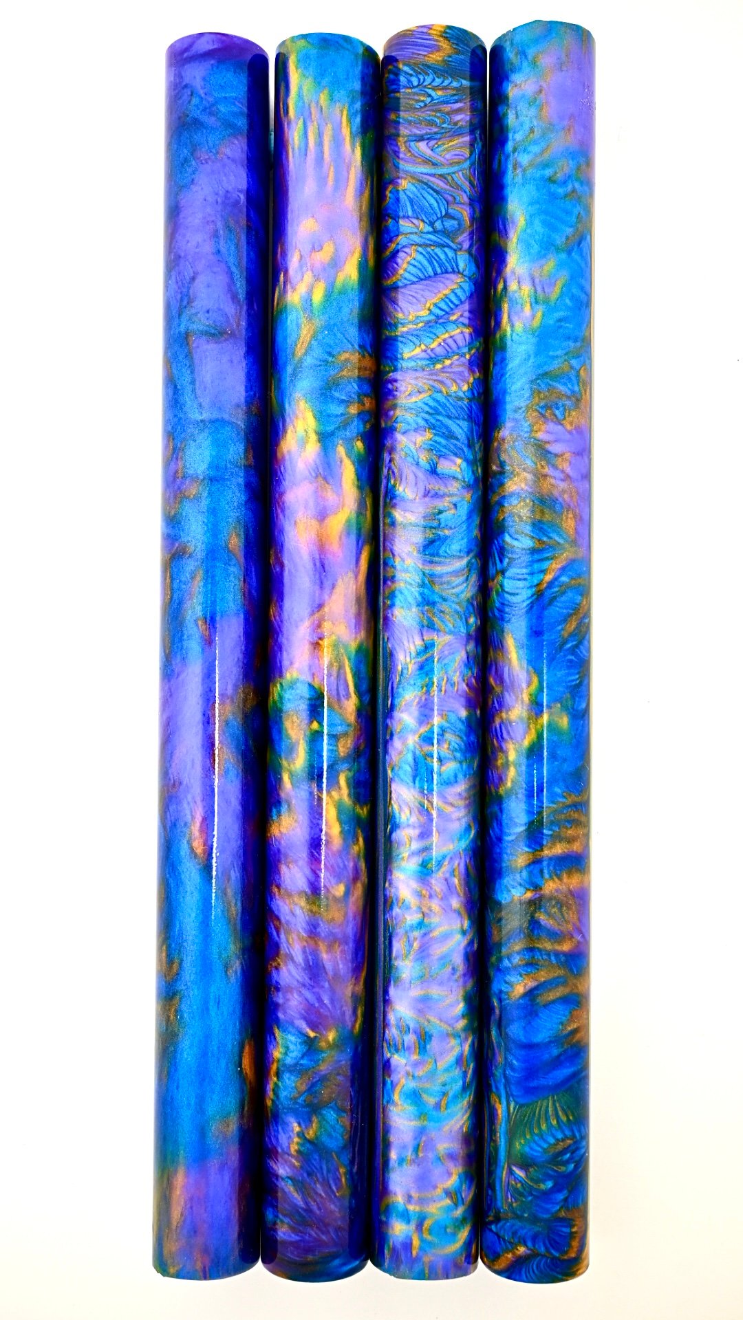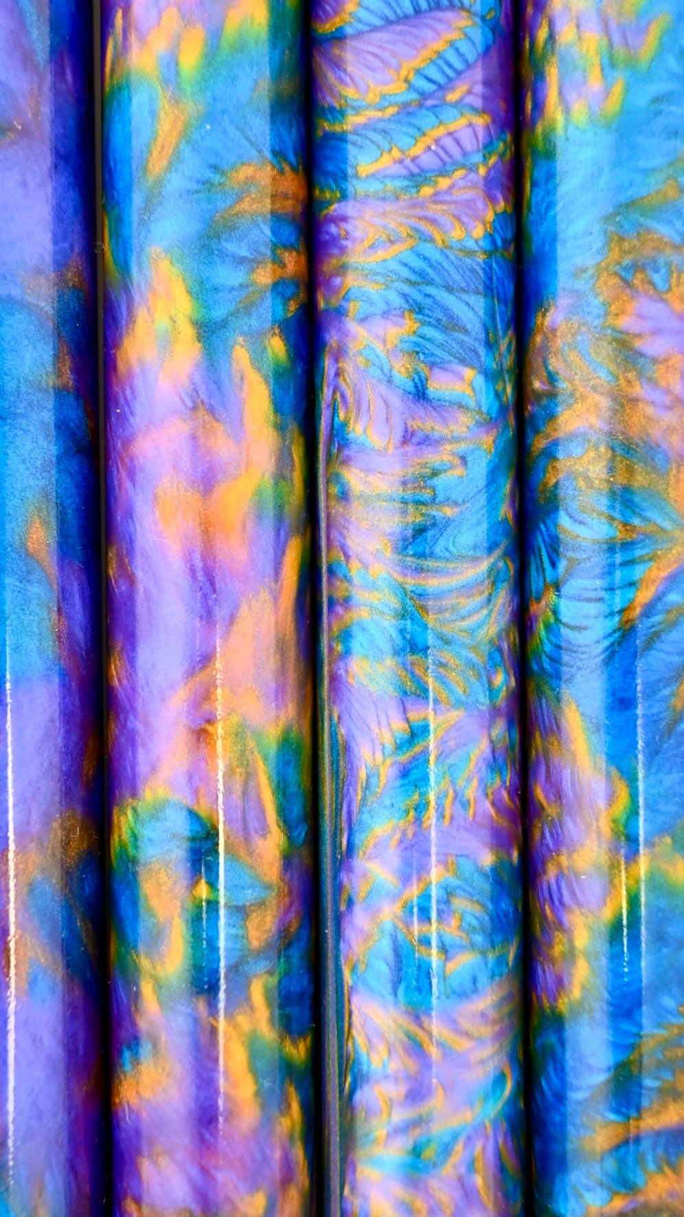 Premium, one of a kind custom bespoke pen blanks. High pressure cast and cured with Alumilite Resin®. 'Tally-Ho!' is cast using translucent dyes and high grade pigments with shades of blue and purple, turquoise and thin ribbons of Aztec Gold running throughout the blank. It's a stunning blank!! Made in small batches. These are exclusive, top of the line blanks we offer to custom Makers of any high end craft. It's sure to please and make any beautiful item!